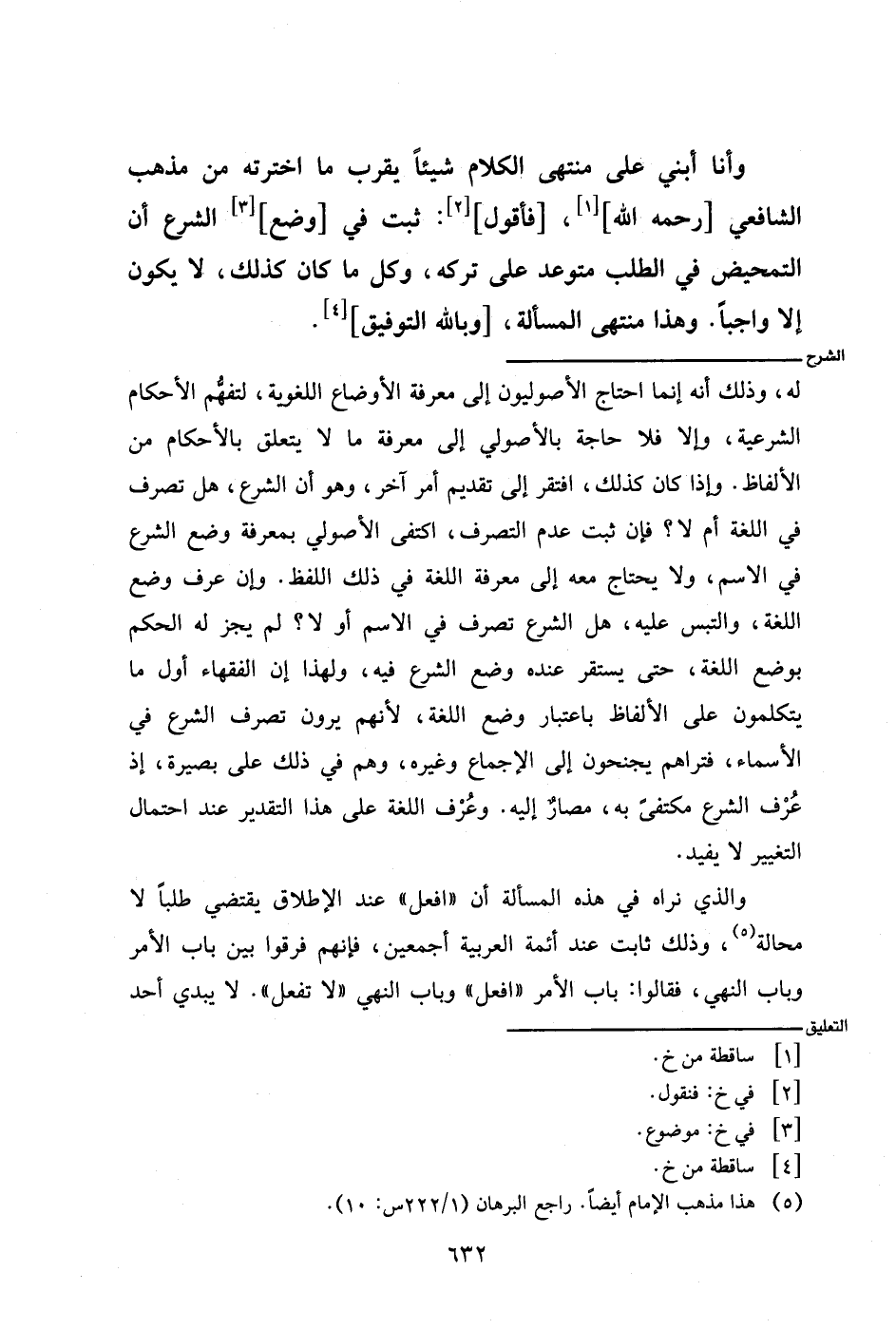 له، وذلك أنه إنما احتاج الأصوليون إلى معرفة الأوضاع اللغوية، لتفهم الأحكام الشرعية، وإلا فلا حاجة بالأصولي إلى معرفة ما لا يتعلق بالأحكام من الألفاظ. وإذا كان كذلك، افتقر إلى تقديم أمر آخر، وهو أن الشرع، هل تصرف في اللغة أم لا؟ فإن ثبت عدم التصرف، اكتفى الأصولي بمعرفة وضع الشرع في الاسم، ولا يحتاج معه إلى معرفة اللغة في ذلك اللفظ. وإن عرف وضع اللغة، والتبس عليه، هل الشرع تصرف في الاسم أو لا؟ لم يجز له الحكم بوضع اللغة، حتى يستقر عنده وضع الشرع فيه، ولهذا إن الفقهاء أول ما يتكلمون على الألفاظ باعتبار وضع اللغة، لأنهم يرون تصرف الشرع في الأسماء، فترام يجنحون إلى الإجماع وغيره، وهم في ذلك على بصيرة، إذ عرف الشرع مكتفى به، مصار إليه. وعرف اللغة على هذا التقدير عند احتمال التغيير لا يفيد.