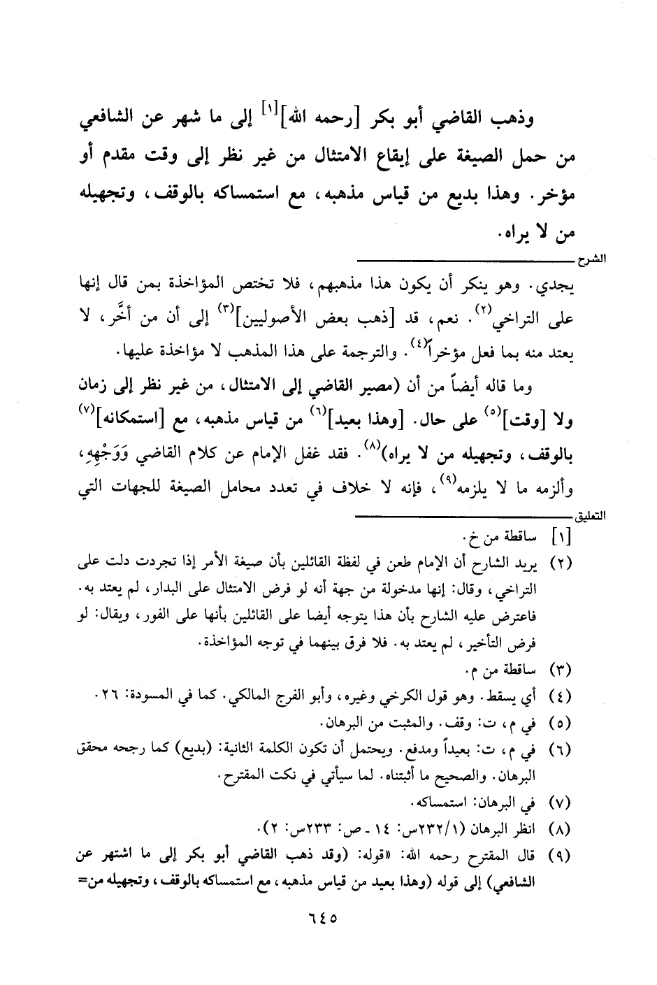 وما قال أيضا من أن (مصير القاضي إلى الامتثال، من غير نظر إلى زمان ولا [وقت] على حال. [وهذا بعيد] من قياس مذهبه، مع [استمكانه] بالوقف، وتجهيله من لا يراه). فقد غفل الإمام عن كلام القاضي ووجهه، وألزمه ما لا يلزمه، فإنه لا خلاف في تعدد محامل الصيغة للجهات التي