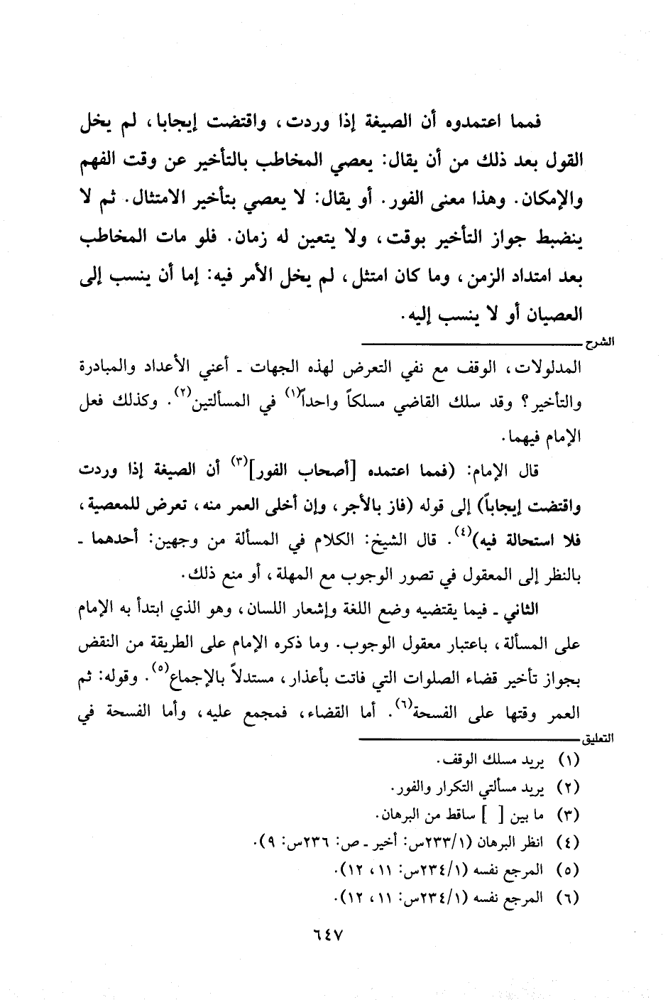 الثاني- فيما يقتضيه وضع اللغة وإشعار اللسان، وهو الذي ابتدأ به الإمام على المسألة، باعتبار معقول الوجوب. وما ذكره الإمام على الطريقة من النقض بجوار تأخير قضاء الصلوات التي فاتت بأعذار، مستدلا بالإجماع. وقوله: ثم العمر وقتها على الفسحة. أما القضاء، فمجمع عليه، وأما الفسحة في