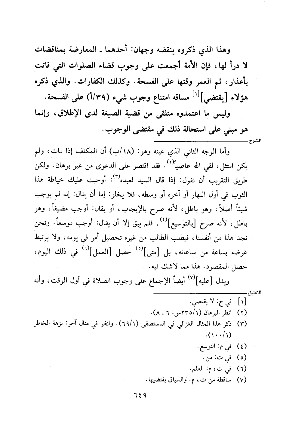وأما الوجه الثاني الذي عينه وهو: (١٨/ب) أن المكلف إذا مات، ولم يكن امتثل، لقي الله عاصيا. فقد اقتصر على الدعوى من غير برهان. ولكن طريق التقريب أن نقول: إذا قال السيد لعبده: أوجبت عليك خياطة هذا الثوب في أول النهار أو آخره أو وسطهن فلا يخلو: إما أن يقال: إنه لم يوجب شيئا أصلا، وهو باطل، لأنه صرح بالإيجاب، أو يقال: أوجب مضيقا، وهو باطل، لأنه صرح [بالتوسيع]، فلم يبق إلا أن يقال: أوجب موسعا. ونحن نجد هذا من أنفسنا، فيطلب الطالب من غيره تحصيل أمر في يومه، ولا يرتبط غرضه بساعة من ساعاته، بل [متى] حصل [العمل] في ذلك اليوم، حصل المقصود. هذا مما لا شك فيه.