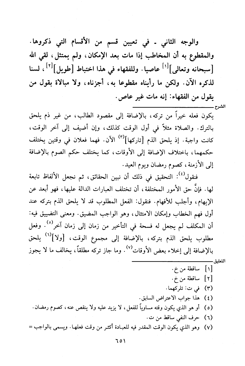 فنقول: التحقيق في ذلك أن نبين الحقائق، ثم نجعل الألفاظ تابعة لها. فإن حق الأمور المختلفة، أن تختلف العبارات الدالة عليها، فهو أبعد عن الإيهام، وأجلب للأفهام. فنقوم: الفعل المطلوب قد يلحق الذم بتركه عند أول الخطاب وإمكان الامتثال، وهو الواجب المضيق. ومعنى التضييق فيه: أن المكلف لم يجعل له فسحة في التأخير من زمان إلى زمان آخر. وفعل مطلوب يلحق الذم بتركه، بالإضافة إلى مجموع الوقت، [ولا] يلحق بالإضافة إلى إخلاء بعض الأوقات. وما جاز تركه مطلقان يخالف ما لا يجوز