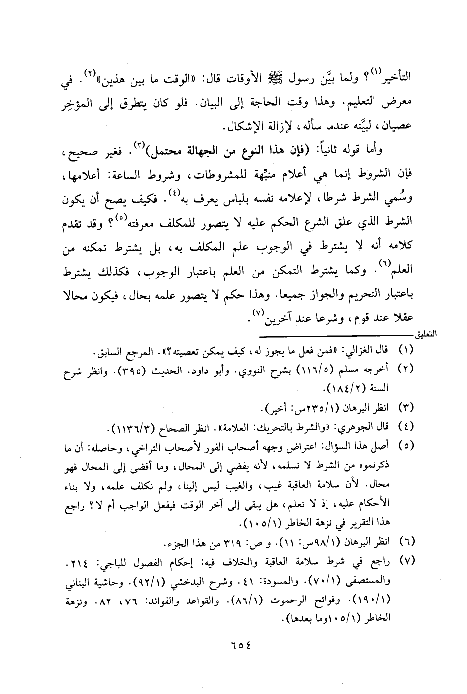 وأما قوله ثانيا: (فإن هذا النوع من الجهالة محتمل). فغير صحيح، فإن الشروط إنما هي أعلام منبهة للمشروطات، وشروط الساعة: أعلامها، وسمي الشرط شرطا لإعلامه نفسه بلباس يعرف به، فكيف يصح أن يكون الشرط الذي علق الشرط الحكم عليه لا يتصور للمكلف معرفته؟ وقد تقدم كلامه أنه لا يشترط في الوجوب علم المكلف به، بل يشترط تمكنه من العلم. وكما يشترط التمكن من العلم باعتبار الوجوب، فكذلك يشترط باعتبار التحريم والجواز جميعا. وهذا حكم لا يتصور علمه بحال، فيكون محالا عقلا عند قوم، وشرعا عند آخرين.