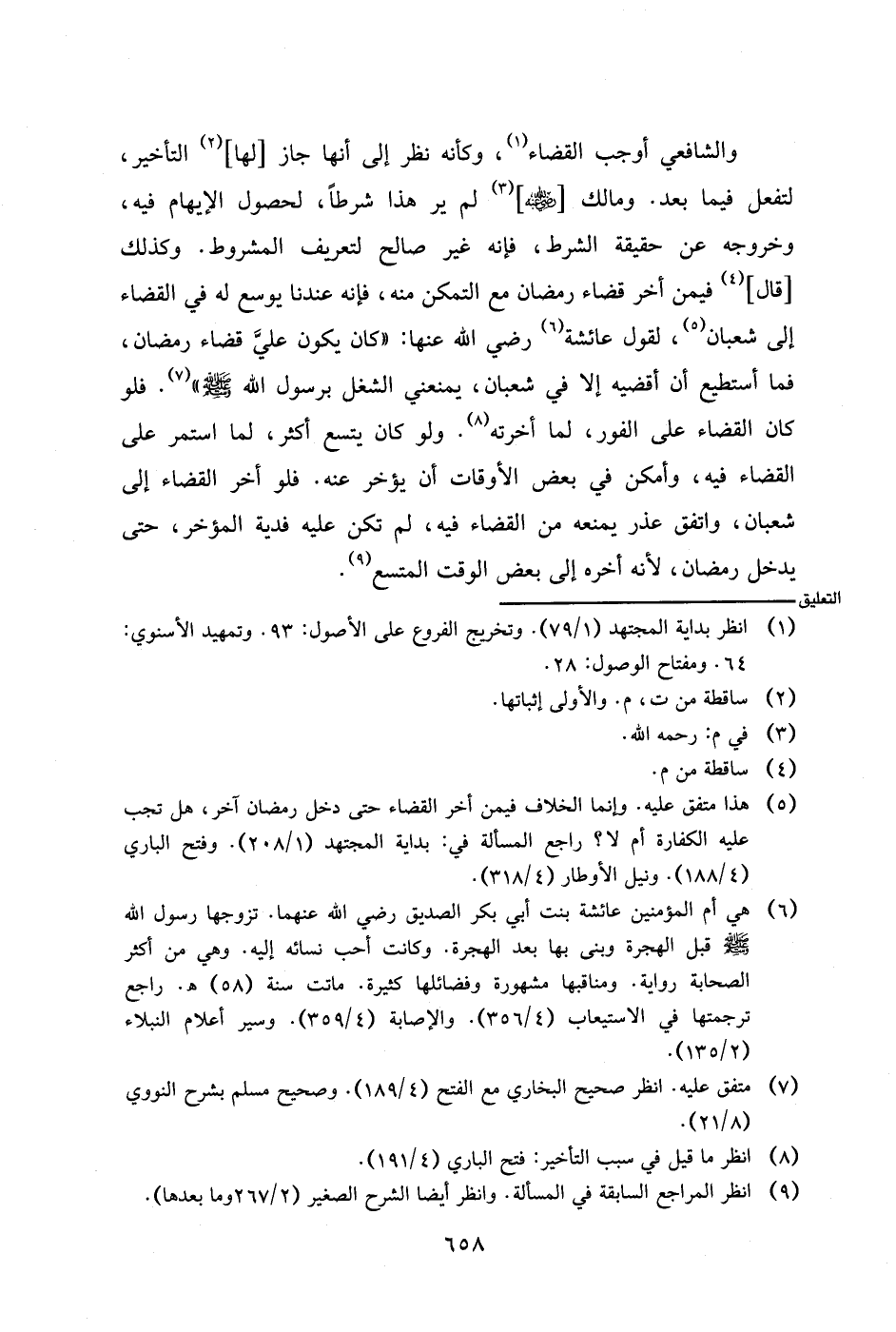 والشافعي أوجب القضاء، وكأنه نظر إلى أنها جاز [لها] التأخير، لتفعل فيما بعد. ومالك [رضي الله عنه] لم ير هذا شرطا، لحصول الإبهام فيه، وخروجه عن حقيقة الشرط، فإنه غير صالح لتعريف المشروط. وكذلك [قال] فيمن أخر قضاء رمضان مع التمكن منه، فإنه عندنا يوسع له في القضاء إلى شعبان، لقول عائشة رضي الله عنها: (كان يكون علي قضاء رمضان، فما أستطيع أن أقضيه إلا في شعبان، يمنعني الشغل برسول الله صلى الله عليه وسلم). فلو كان القضاء على الفور، لما أخرته. ولو كان يتسع أكثر، لما استمر على القضاء فيه، وأمكن في بعض الأوقات أن يؤخر عنه. فلو أخر القضاء إلى شعبان، واتفق عذر يمنعه من القضاء فيه، لم تكن عليه فدية المؤخر، حتى يدخل رمضان، لأنه أخره إلى بعض الوقت المتسع.