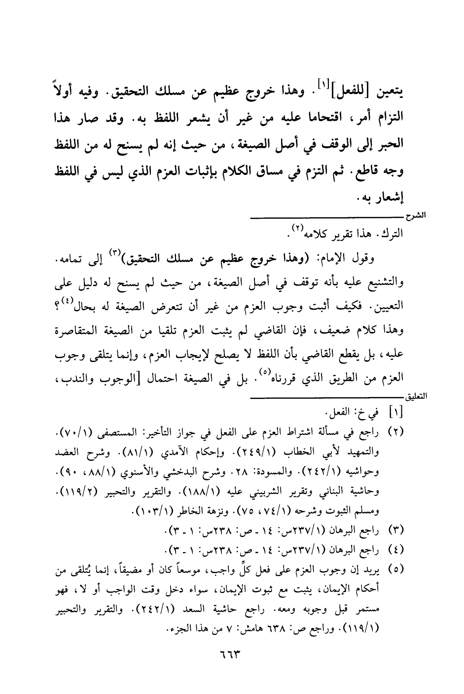 وقول الإمام: (وهذا خروج عظيم من مسلك التحقيق) إلى تمامه. والتشنيع عليه بأنه توقف في أصل الصيغة، من حيث لم يسنح له دليل على التعيين. فكيف أثبت وجوب العزم من غير أن تتعرض الصيغة له بحال؟ وهذا كلام ضعيف، فإن القاضي لم يثبت العزم تلقيا من الصيغة المتقاصرة عليه، بل يقطع القاضي بأن اللفظ لا يصلح لإيجاب العزم، وإنما يتلقى وجوب العزم من الطريق الذي قررناه. بل في الصيغة احتمال [الوجوب والندب،