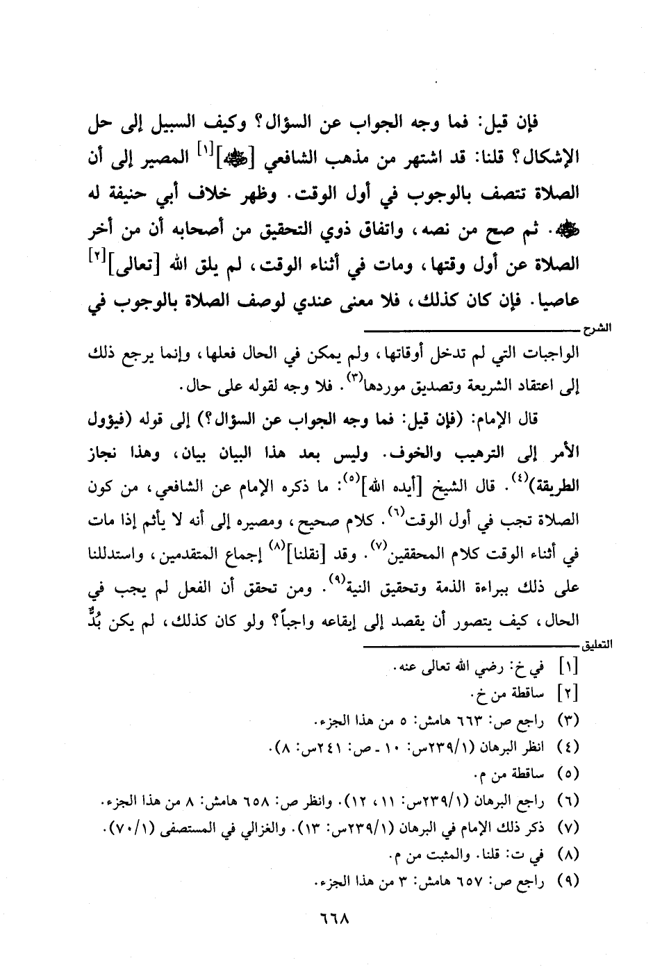قال الإمام: (فإن قيل: فما وجه الجواب عن السؤال) إلى قوله (فيؤول الأمر إلى الترهيب والخوف. وليس بعد هذا البيان بيان، وهذا نجاز الطريقة). قال الشيخ [أيده الله]: ما ذكره الإمام عن الشافعي، من كون الصلاة تجب في أول الوقت. كلام صحيح، ومصيره إلى أنه لا يأثم إذا مات في أثناء الوقت كلام المحققين. وقد [نقلنا] إجماع المتقدمين، واستدللنا على ذلك ببراءة الذمة وتحقيق النية. ومن تحقق أن الفعل لم يجب في الحال، كيف يتصور أن يقصد إلى إيقاعه واجبا؟ ولو كان كذلك، لم يكن بد