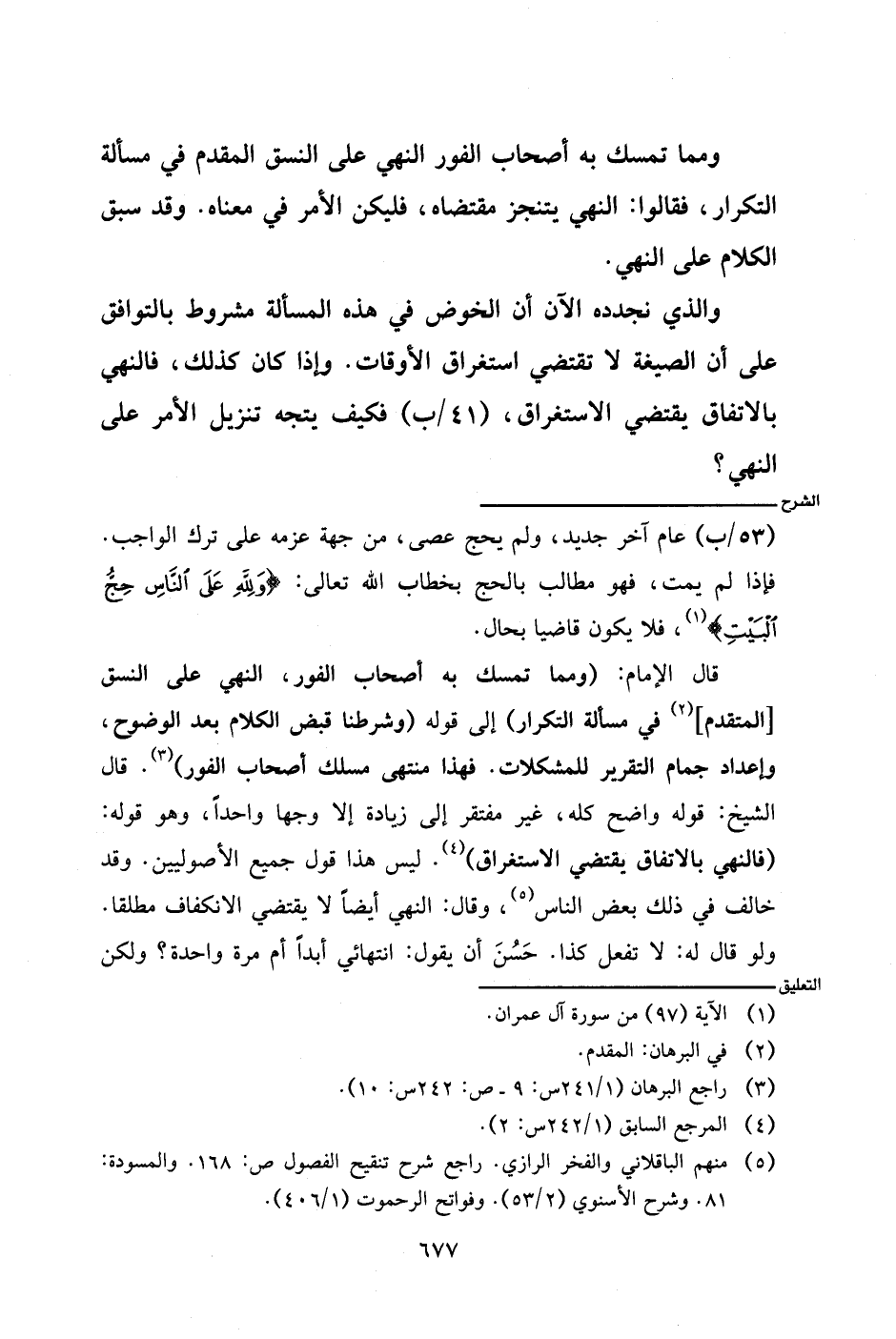 قال الإمام: (ومما تمسك به أصحاب الفور، النهي على النسق [المتقدم] في مسألة التكرار) إلى قوله (وشرطنا قبض الكلام بعد الوضوح، وإعداد جمام التقرير للمشكلات. فهذا منتهى مسلك أصحاب الفور). قال الشيخ: قوله واضح كله، غير مفتقر إلى زيادة إلا وجها واحدا، وهو قوله: (فالنهي بالاتفاق يقتضي الاستغراق). ليس هذا قول جميع الأصوليين. وقد خالف في ذلك بعض الناس، وقال: النهي أيضا الانكفاف مطلقا. ولو قال له: لا تفعل كذا. حسن أن يقول: انتهائي أبدا أم مرة واحدة؟ ولكن