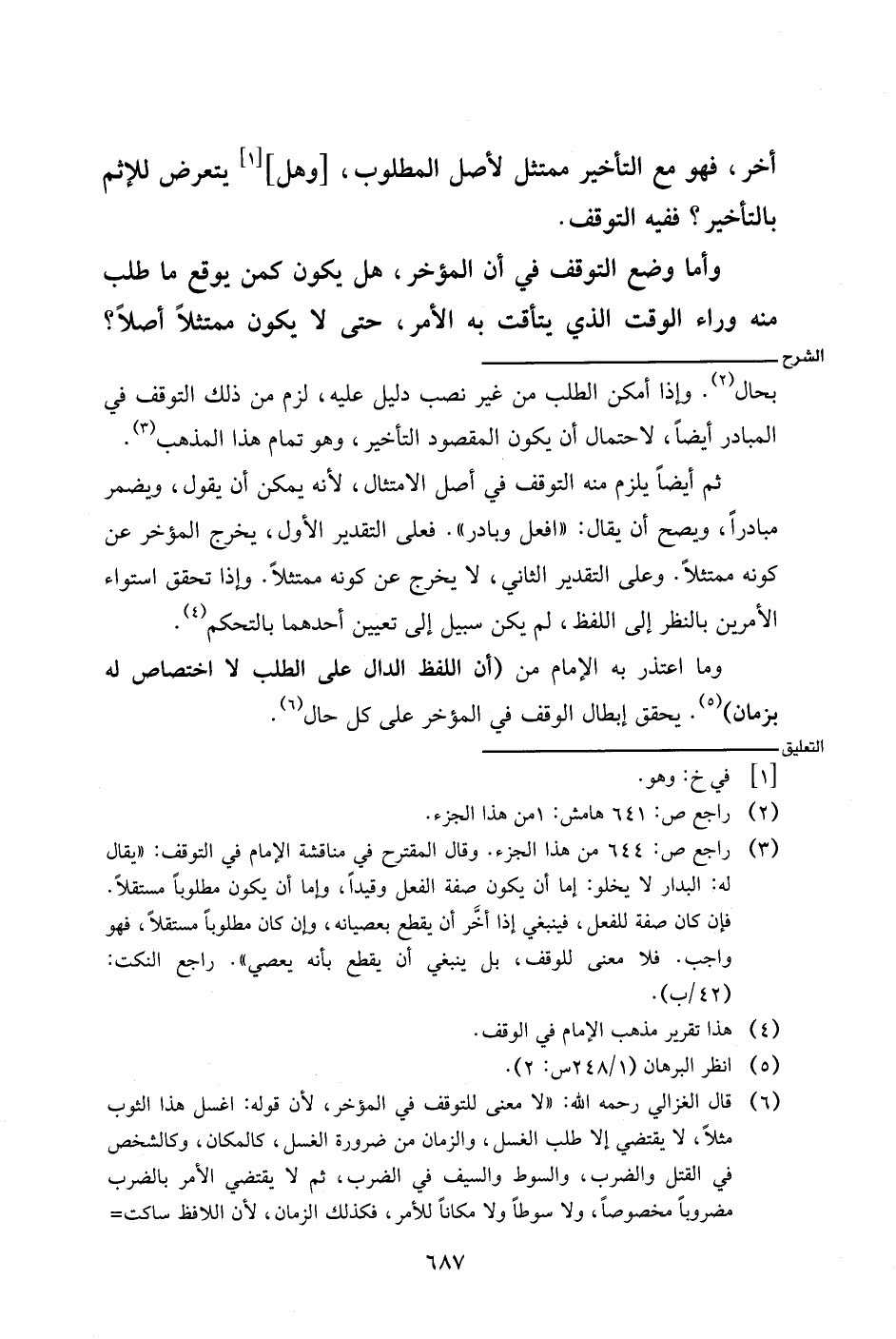 ثم أيضا يلزم منه التوقف في أصل امتثال، لأنه يمكن أن يقول، ويضمر مبادرا، ويصح أن يقال: (افعل وبادر). فعلى التقدير الأول، يخرج المؤخر عن كونه ممتثلا. وعلى التقدير الثاني، لا يخرج عن كونه ممتثلا. وإذا تحقق استواء الأمرين بالنظر إلى اللفظ، لم يكن سبيل إلى تعيين أحدهما بالتحكم.