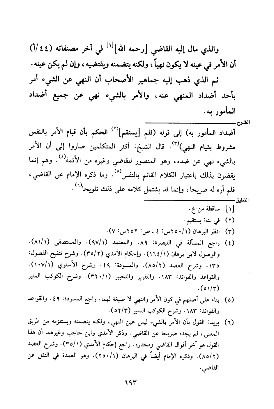 أضداد المأمور به) إلى قوله (فلم [يستقم] الحكم بأن قيام الأمر بالنفس مشروط بقيام النهي). قال الشيخ: أكثر المتكلمين صاروا إلى أن الأمر بالشيء نهي عن ضده، وهو المنصور للقاضي وغيره من الأئمة. وهم إنما يقضون بذلك باعتبار الكلام القائم بالنفس. وما ذكره الإمام عن القاضي، فلم أره له صريحان وإنما قد يشتمل كلامه على ذلك تلويحا.