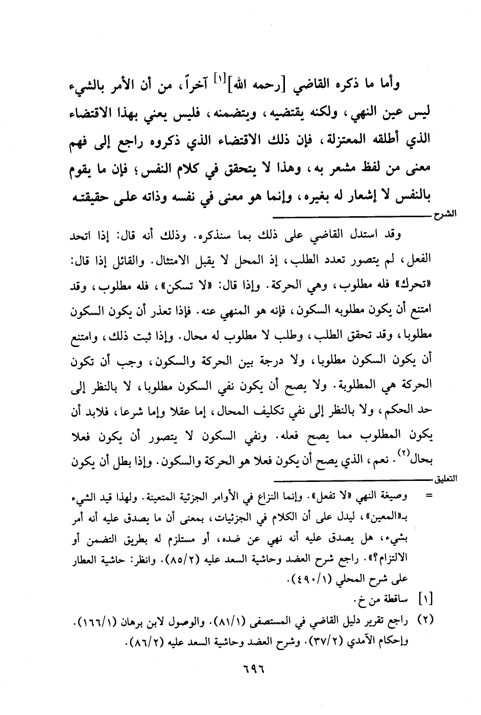 وقد استدل القاضي على ذلك بما سنذكره. وذلك أنه قال: إذا اتحد الفعل، لم يتصور تعدد الطلب، إذا المحل لا يقبل الامتثال. والقائل إذا قال: (تحرك) فله مطلوب، وهي الحركة. وإذا قال: (لا تسكن)، فله مطلوب، وقد امتنع أن يكون مطلوبه السكون، فإنه هو المنهي عنه. فإذا تعذر أن يكون السكون مطلوبا، وقد تحقق الطلب، وطلب لا مطلوب له محال. وإذا ثبت ذلك، وامتنع أن يكون السكون مطلوبا، وقد تحقق الطلب، وطلب لا مطلوب له محال. وإذا ثبت ذلك، وامتنع أن يكون السكون مطلوبا، ولا درجة بين الحركة والسكون، وجب أن تكون الحكة هي المطلوبة. ولا يصح أن يكون نفي السكون مطلوبا، لا بالنظر إلى حد الحكم، ولا بالنظر إلى نفي تكليف المحال، إما عقلا وإما شرعا، فلا بد أن يكون المطلوب مما يصح فعله. ونفي السكون لا يتصور أن يكون فعلا بحال. نعم، الذي يصح أن يكون فعلا هو الحركة والسكون. وإذا بطل أن يكون