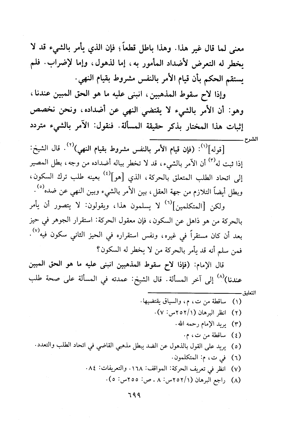 ولكن [المتكلمين] لا يسلمون هذا، ويقولون: لا يتصور أن يأمر بالحركة من هو ذاهل عن السكون، فإن معقول الحركة: استقرار الجوهر في حيز بعد أن كان مستقرا في غيره، ونفس الاستقرار في الحيز الثاني سكون فيه.