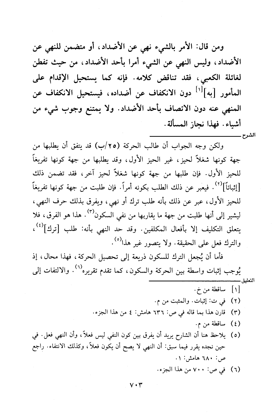 ولكن وجه الجواب أن طالب الحركة (٢٥/ب) قد يتفق أن يطلبها من جهة كونها شغلا لحيز، غير الحيز الأول، وقد يطلبها من جهة كونها تفريغا للحيز الأول. فإن طلبها من جهة كونها شغلا لحيز آخر، فقد تضمن ذلك [إثباتا]. فيعبر عن ذلك الطلب بكونه أمرا. فإن طلبت من جهة كونها تفريغا للحيز الأول، عبر عن ذلك بأنه طلب ترك أو نهي، ويفرق بذلك حرف النهي، ليشير إلى أنها طلبت من جهة ما يقاربها من نفي السكون. هذا هو الفرق، فلا يتعلق التكليف إلا بأفعال المكلفين. وقد حد النهي بأنه: طلب [ترك]، والترك فعل على الحقيقة. ولا يتصورها غير هذا.
