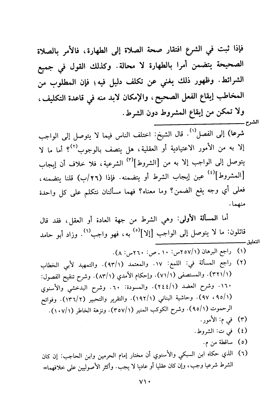 شرعا) إلى الفصل. قال الشيخ: اختلف الناس فيما لا يتوصل إلى الواجب إلا به من الأمور الاعتيادية أو العقلية، هل يتصل بالوجوب؟ أما ما لا يتوصل إلى الواجب إلا به من [الشروط] الشرعية، فلا خلاف أن إيجاب [المشروط] عين إيجاب الشرط أو يتضمنه. فإذا (٢٦/ب) قلنا يتضمنه، فعلى أي وجه يقع الضمن؟ وما معناه؟ فهما مسألتان نتكلم على كل واحدة منهما.