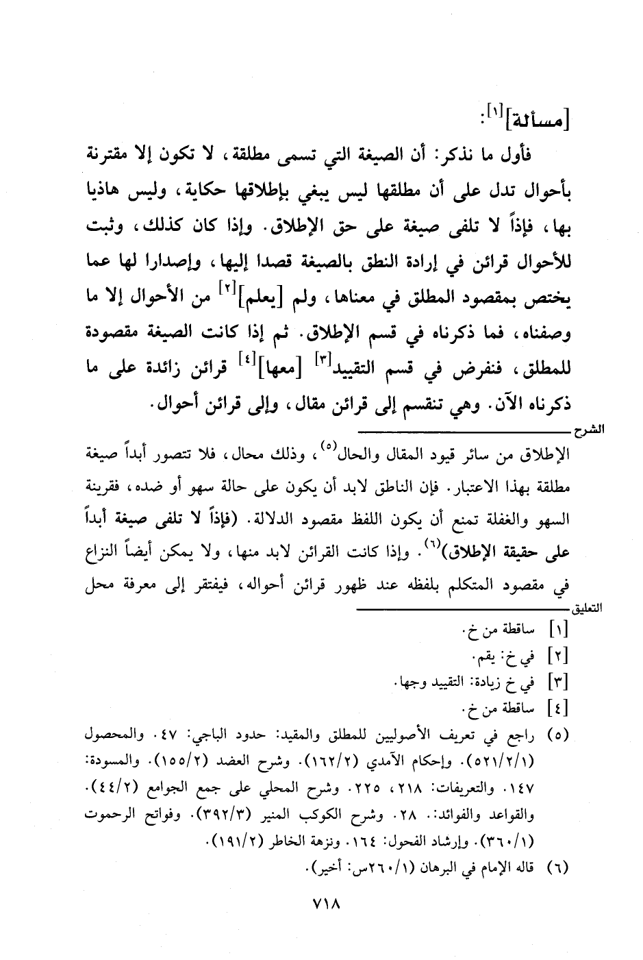الإطلاق من سائر قيوم المقال والمحال، وذلك محال، فلا تتصور أبدا صيغة مطلقة بهذا الاعتبار. فإن الناطق لا بد أن يكون على حاله سهو أو ضده، فقرينة السهو والغفلة تمنع أن يكون اللفظ مقصود الدلالة. (فإذا لا تلفى صيغة أبدا على حقيقة الإطلاق). وإذا كانت القرائن لا بد منها، ولا يمكن أيضا النزاع في مقصود المتكلم بلفظه عند ظهور قرائن أحواله، فيفتقر إلى معرفة محل
