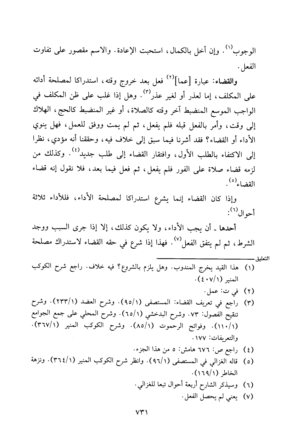 والقضاء: عبارة [عما] فعل بعد خروج وقته، استدراكا لمصلحة أدائه على المكلف، إما لعذر أو لغير عذر. وهل إذا غلب على ظن المكلف في الواجب الموسع المنضبط آخر وقته كالصلاة، أو غير المنضبط كالحج، والهلاك إلى وقت، وأمر بالفعل قبله فلم يفعل، ثم لم يمت ووفق للعمل، فهل ينوي الأداء أو الاقتضاء؟ فقد أشرنا فيما سبق إلى خلاف فيه، وحققنا أنه مؤدين نظرا إلى الاكتفاء بالطلب الأول، وافتقار القضاء إلى طلب جديد. وكذلك لزمه قضاء صلاة على الفور فلم يفعل، ثم فعل فيما بعد، فلا نقول إنه قضاء القضاء.
