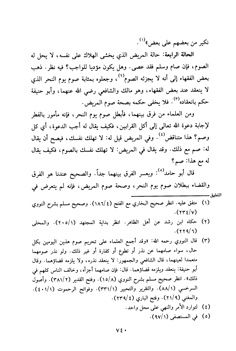 ومن العلماء من فرق بينهما، فأبطل صوم يوم النحر، فإنه مأمور بالفطر لإجابة دعوة الله تعالى إلى أكل القرابين، فكيف يقال له أجب الدعوة، أي كل وصم؟ هذا متناقض. وفي المريض قيل له: لا تهلك نفسك، فيصح أن يقال له: صم مع ذلك. وقد يقال في المريض: لا تهلك فسك بالصوم، فكيف يقال له مع هذا: صم؟