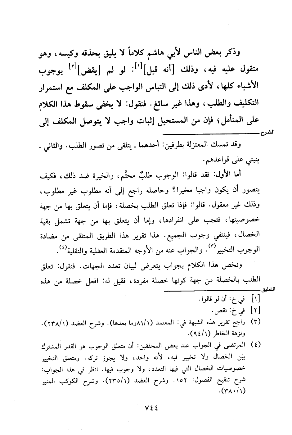 وقد تمسك المعتزلة بطرفين: أحدهما- يتلقى من تصور الطلب. والثاني- ينبي على قواعدهم.