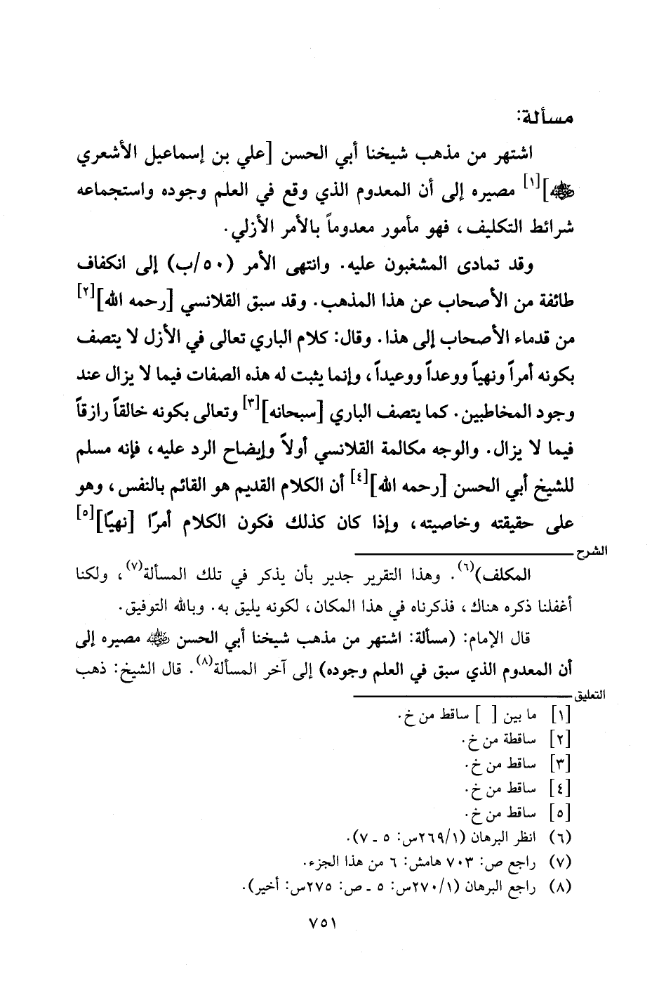 قال الإمام: (مسألة: اشتهر من مذهب شيخنا أبي الحسن - رضي الله عنه - مصيره إلى أن المعدوم الذي سبق في العلم وجوده) إلى آخر المسألة. قال الشيخ: ذهب