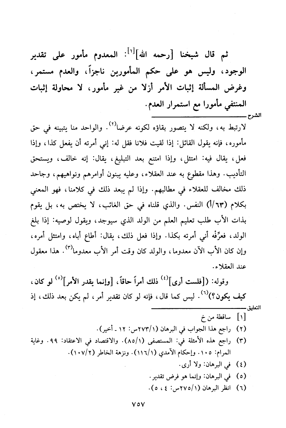 لارتبط به، ولكنه لا يتصور بقاؤه لكونه عرضا. والواحد منا يتبينه في حق مأموره، فإنه يقول القائل: إذا لقيت فلانا فقل له: إني أمرته أن يفعل كذا، وإذا فعل، يقال فيه: امتثل، وإذا بعد التبليغ، يقال: إنه خالف، ويستحق التأديب. وهذا مقطوع به عند العقلاء، وعليه يبنون أوامرهم ونواهيهم، وجاحد ذلك مخالف للعقلاء في مطالبهم. وإذا لم يبعد ذلك في كلامنا، فهو المعني بكلام (٦٣/أ) النفس. والذي قلناه في حق الغائب، لا يختص به، بل يقوم بذات الأب طلب تعليم العلم من الولد الذي سيوجد، ويقول لوصيه: إذا بلغ الولد، فعرفه أني أمرته بكذا. وإذا فعل ذلك، يقال: أطاع أباه، وامتثل أمره، وإن كان الأب الآن معدوما، والولد كان وقت أمر الأب معدوما. هذا معقول عند العقلاء.