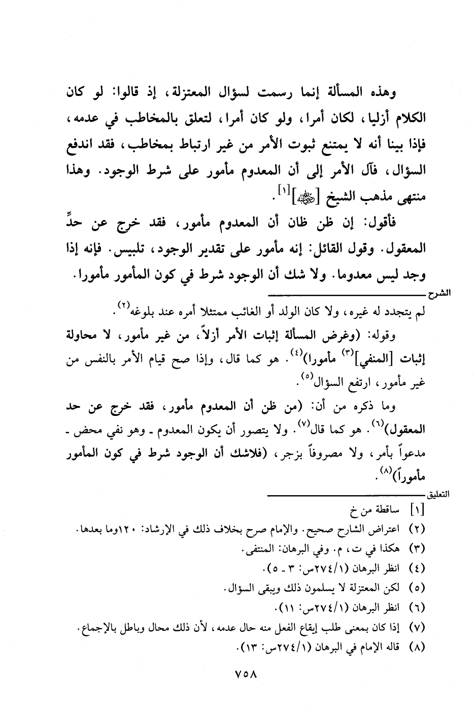 وما ذكره من أن: (من ظن أن المعدوم مأمور، فقد خرج عن حد المعقول). هو كما قال. ولا يتصور أن يكون المعدوم- وهو في نحض- مدعوا بأمر، ولا مصروفا بزجر، (فلا شك أن الوجود شرط في كون المأمور مأمورا).