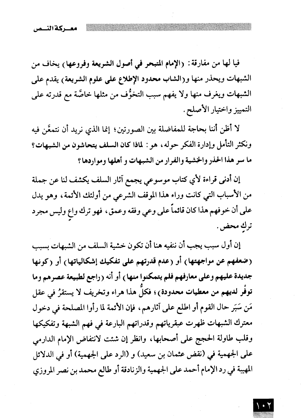 إن أول سبب يجب أن ننفيه هنا أن تكون خشية السلف من الشبهات بسبب (ضعفهم عن مواجهتها) أو (عدم قدرتهم على تفكيك إشكالياتها) أو (كونها جديدة عليهم وعلى معارفهم فلم يتمكنوا منها) أو أنه (راجع لطبيعة عصرهم وما توفَّر لديهم من معطيات محدودة)، فكلُّ هذا هواء وتخويف لا يستقرُ في عقل مَن سَبَر حال القوم أو اطلع على آثارهم، فإن الأئمة لما رأوا المصلحة في دخول معترك الشبهات ظهرت عبقرياتهم وقدراتهم البارعة في فهم الشبهة وتفكيكها وقلب طاولة الحجج على أصحابها، وانظر إن شئت لانتفاض الإمام الدارمي على الجهمية في (نقض عثمان بن سعيد) و (الرد على الجهمية) أو في الدلائل المهيبة في رد الأمام أحمد على الجهمية والزنادقة أو طالع محمد بن نصر المروزي