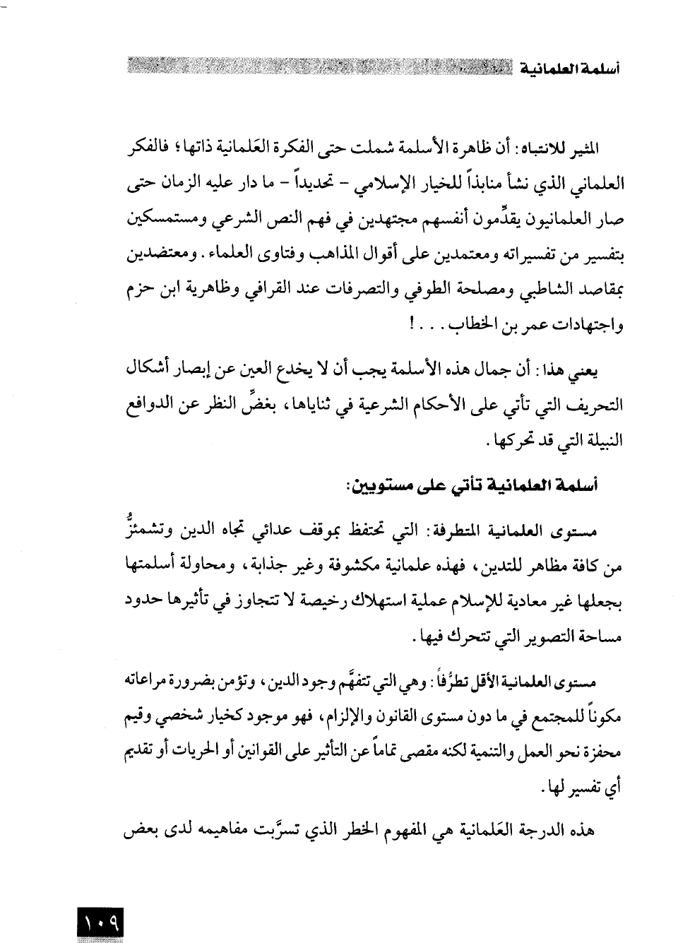 المثير للانتباه: أن ظاهرة الأسلمة شملت حتى الفكرة العَلمانية ذاتها؛ فالفكر العلماني الذي نشأ منابذًا للخيار الإسلامي -تحديدًا- ما دار عليه الزمان حتى صار العلمانيون يقدِّمون أنفسهم مجتهدين في فهم النص الشرعي ومستمسكين بتفسير من تفسيراته ومعتمدين على أقوال المذاهب وفتاوى العلماء. ومعتضدين بمقاصد الشاطبي ومصلحة الطوفي والتصرفات عند القرافي وظاهرية ابن حزم واجتهادات عمر بن الخطاب. . .!