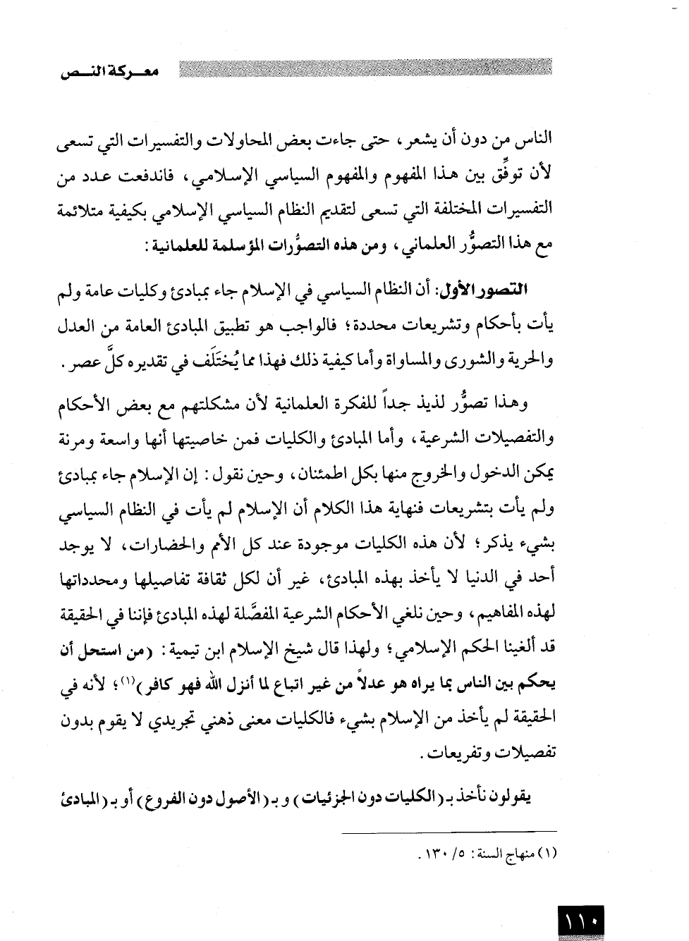 وهذا تصوُّر لذيذ جدًا للفكرة العلمانية لأن مشكلتهم مع بعض الأحكام والتفصيلات الشرعية، وأما المبادئ والكليات فمن خاصيتها أنها واسعة ومرنة يمكن الدخول والخروج منها بكل اطمئنان، وحين نقول: إن الإسلام جاء بمبادئ ولم يأت بتشريعات فنهاية هذا الكلام أن الإسلام لم يأت في النظام السياسي بشيء يذكر؛ لأن هذه الكليات موجودة عند كل الأمم والحضارات، لا يوجد أحد في الدنيا لا يأخذ بهذه المبادئ، غير أن لكل ثقافة تفاصيلها ومحدداتها لهذه المفاهيم، وحين نلغي الأحكام الشرعية المفصَّلة لهذه المبادئ فإننا في الحقيقة قد ألغينا الحكم الإسلامي؛ ولهذا قال شيخ الإسلام ابن تيمية: (من استحل أن يحكم بين الناس بما يراه هو عدلًا من غير اتباع لما أنزل اللَّه فهو كافر) (¬1)؛ لأنه في الحقيقة لم يأخذ من الإسلام بشيء فالكليات معنى ذهني تجريدي لا يقوم بدون تفصيلات وتفريعات.