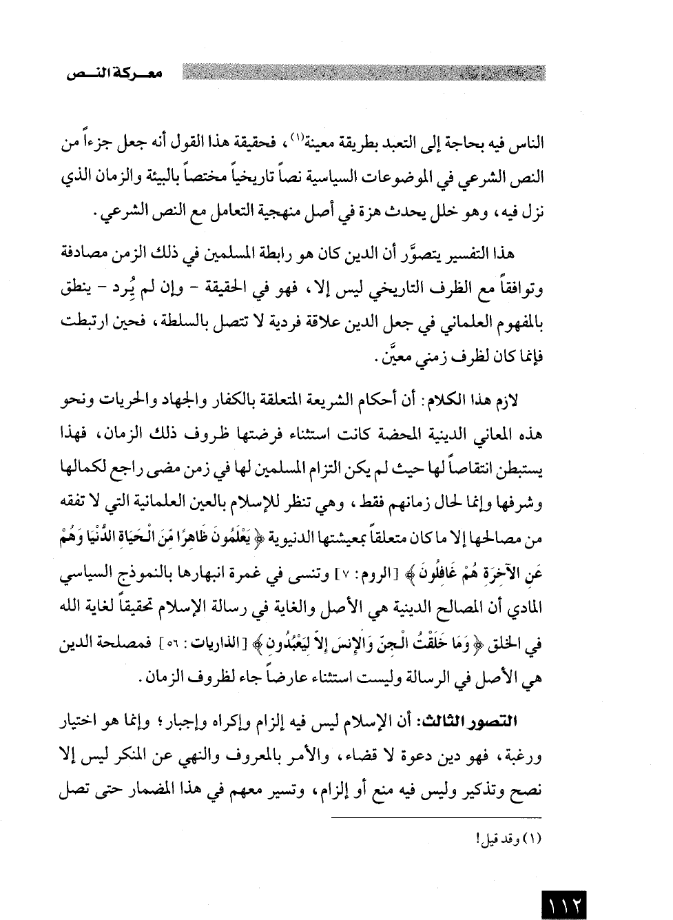 الناس فيه بحاجة إلى التعبد بطريقة معينة (¬1)، فحقيقة هذا القول أنه جعل جزءًا من النص الشرعي في الموضوعات السياسية نصًا تاريخيًا مختصًا بالبيئة والزمان الذي نزل فيه، وهو خلل يحدث هزة في أصل منهجية التعامل مع النص الشرعي.