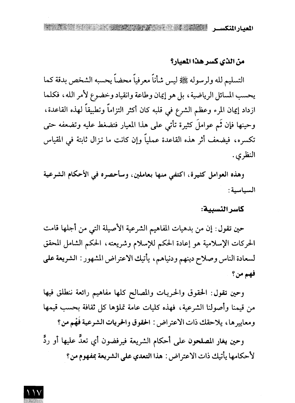 وحين تقول: الحقوق والحريات والمصالح كلها مفاهيم رائعة ننطلق فيها من قيمنا وأصولنا الشرعية، فهذه كليات عامة تملؤها كل ثقافة بحسب قيمها ومعاييرها، يلاحقك ذات الاعتراض: الحقوق والحريات الشرعية فَهْم من؟