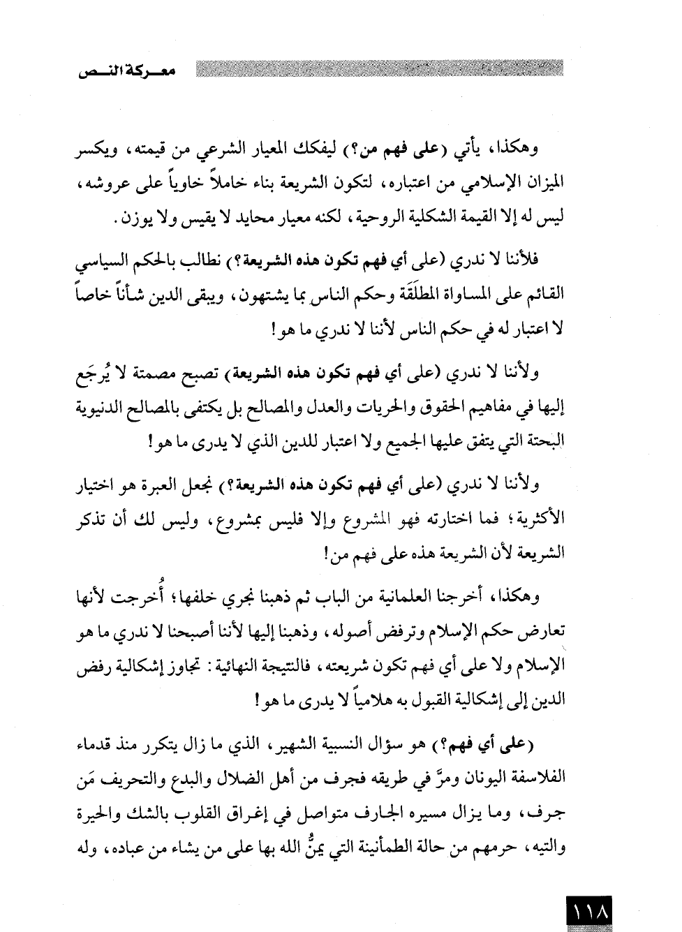 ولأننا لا ندري (على أي فهم تكون هذه الشريعة؟) نجعل العبرة هو اختيار الأكثرية؛ فما اختارته فهو المشروع وإلا فليس بمشروع، وليس لك أن تذكر الشريعة لأن الشريعة هذه على فهم من!