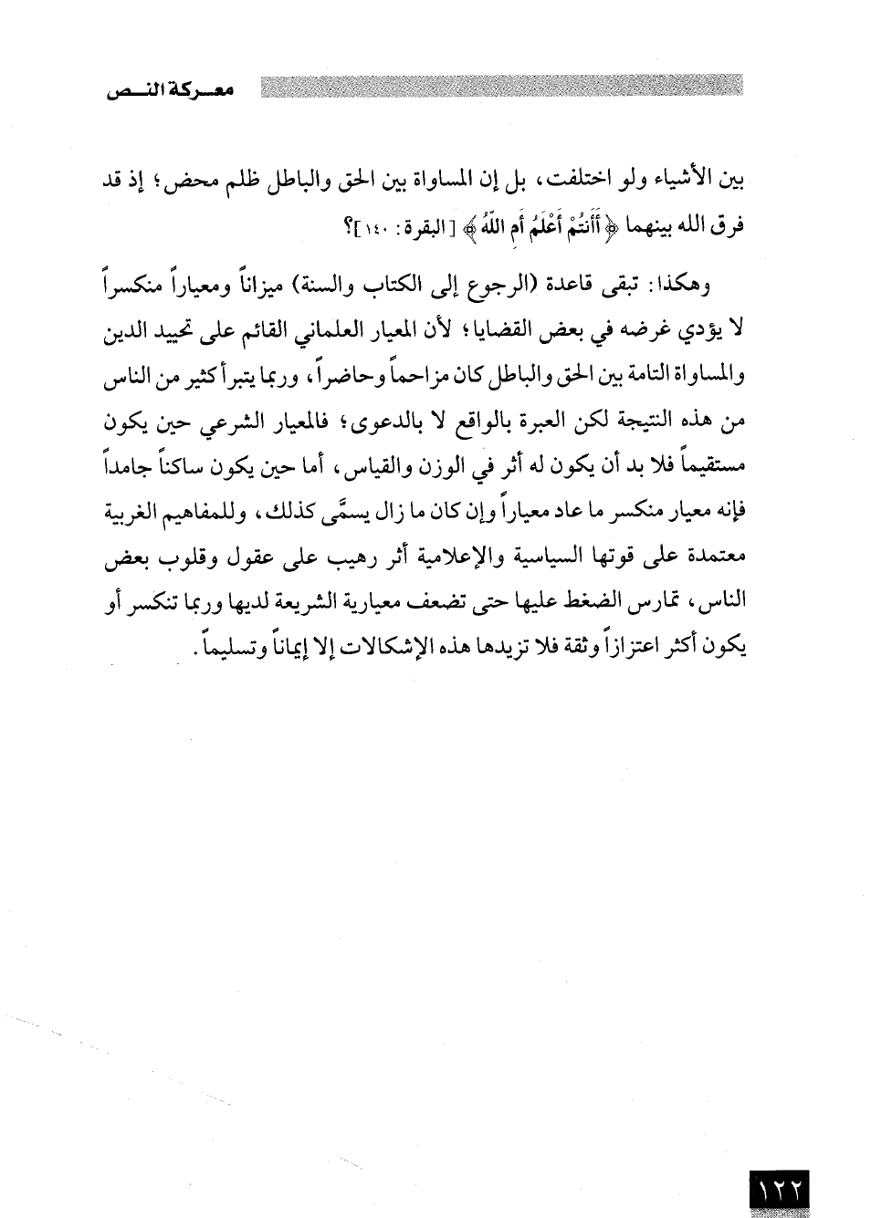 وهكذا: تبقى قاعدة (الرجوع إلى الكتاب والسنة) ميزانًا ومعيارًا منكسرًا لا يؤدي غرضه في بعض القضايا؛ لأن المعيار العلماني القائم على تحييد الدين والمساواة التامة بين الحق والباطل كان مزاحمًا وحاضرًا، وربما يتبرأ كثير من الناس من هذه النتيجة لكن العبرة بالواقع لا بالدعوى؛ فالمعيار الشرعي حين يكون مستقيمًا فلا بد أن يكون له أثر في الوزن والقياس، أما حين يكون ساكنًا جامدًا فإنه معيار منكسر ما عاد معيارًا وإن كان ما زال يسمّى كذلك، وللمفاهيم الغربية معتمدة على قوتها السياسية والإعلامية أثر رهيب على عقول وقلوب بعض الناس، تمارس الضغط عليها حتى تضعف معيارية الشريعة لديها وربما تنكسر أو يكون أكثر اعتزازًا وثقة فلا تزيدها هذه الإشكالات إلا إيمانًا وتسليمًا.