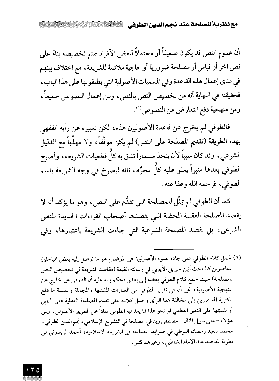 (¬1) حَمْل كلام الطوفي على جادة عموم الأصوليين في الموضوع هو ما توصل إليه بعض الباحثين المعاصرين كالباحث أيمن جبريل الأيوبي في رسالته القيمة (مقاصد الشريعة في تخصيص النص بالمصلحة) حيث جمع كلام الطوفي بعضه إلى بعض فحكم بناء عليه أن الطوفي غير خارج عن المنهجية الأصولية، غير أن في تقرير الطوفي من العبارات المشتبهة والمجملة والملبسة ما دفع بأكثرية المعاصرين إلى مخالفة هذا الرأي وحمل كلامه على تقديم المصلحة العقلية على النص أو تقديمها على النص القطعي أو نحو هذا مما يعد فيه الطوفي شاذًا عن الطريق الأصولي، ومن هؤلاء -على سبيل المثال- مصطفى زيد في المصلحة في التشريع الإسلامي ونجم الدين الطوفي، محمد سعيد رمضان البوطي في ضوابط المصلحة في الشريعة الاسلامية، أحمد الريسوني في نظرية المقاصد عند الإمام الشاطبي، وغيرهم كثير.
