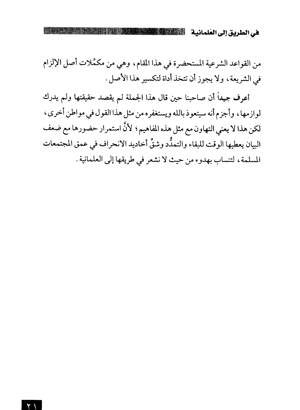 أعرف جيدًا أن صاحبنا حين قال هذا الجملة لم يقصد حقيقتها ولم يدرك لوازمها، وأجزم أنه سيتعوذ باللَّه ويستغفره من مثل هذا القول في مواطن أخرى، لكن هذا لا يعني التهاون مع مثل هذه المفاهيم؛ لأنَّ استمرار حضورها مع ضعف البيان يعطيها الوقت للبقاء والتمدُّد وشقِّ أخاديد الانحراف في عمق المجتمعات المسلمة، لتنساب بهدوء من حيث لا نشعر في طريقها إلى العلمانية.