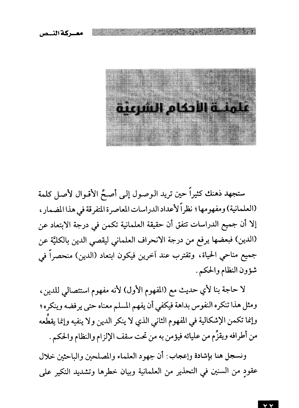 لا حاجة بنا لأى حديث مع (المفهوم الأول) لأنه مفهوم استئصالي للدين, ومثل هذا تنكره النفوس بداهة فيكفي أن يفهم المسلم معناه حتى يرفضه وينكره؛ وإنما تكمن الإشكالية في المفهوم الثاني الذي لا ينكر الدين ولا ينفيه وإنما يقطِّعه من أطرافه ويقزِّم من عليائه فيؤمن به من تحت سقف الإلزام والنظام والحكم.