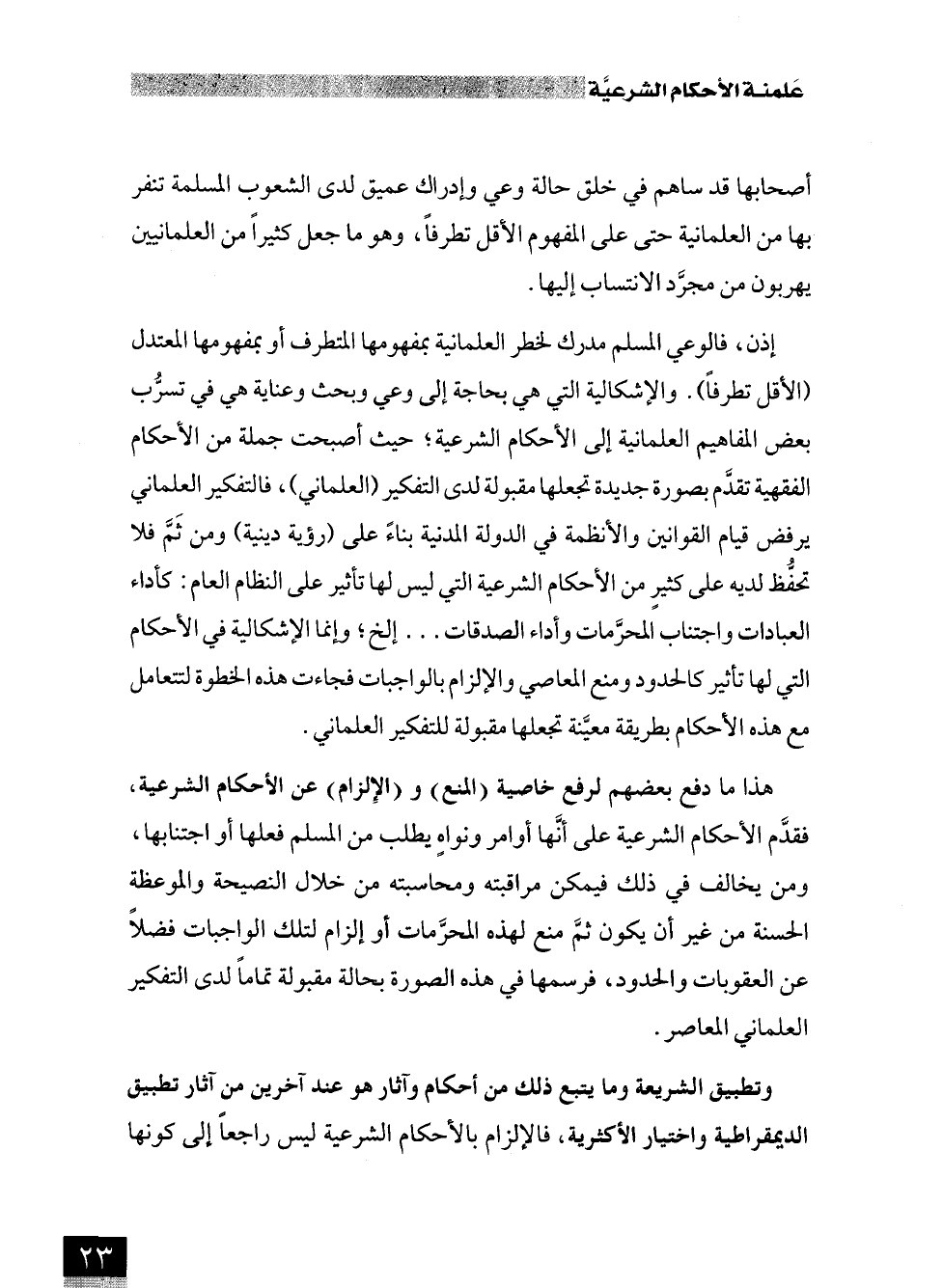إذن، فالوعي المسلم مدرك لخطر العلمانية بمفهومها المتطرف أو بمفهومها العتدل (الأقل تطرفًا). والإشكالية التي هي بحاجة إلى وعي وبحث وعناية هي في تسرُّب بعض المفاهيم العلمانية إلى الأحكام الشرعية؛ حيث أصبحت جملة من الأحكام الفقهية تقدَّم بصورة جديدة تجعلها مقبولة لدى التفكير (العلماني)، فالتفكير العلماني يرفض قيام القوانين والأنظمة في الدولة المدنية بناءً على (رؤية دينية) ومن ثَمَّ فلا تحفُّظ لديه على كثيرٍ من الأحكام الشرعية التي ليس لها تأثير على النظام العام: كأداء العبادات واجتناب المحرَّمات وأداء الصدقات. . . إلخ؛ وإنما الإشكالية في الأحكام التي لها تأثير كالحدود ومنع المعاصي والإلزام بالواجبات فجاءت هذه الخطوة لتتعامل مع هذه الأحكام بطريقة معيَّنة تجعلها مقبولة للتفكير العلماني.
