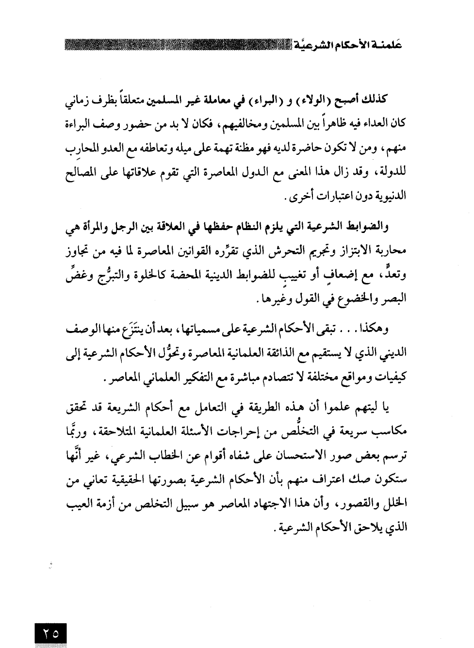 وهكذا. . . تبقى الأحكام الشرعية على مسمياتها، بعد أن ينتَزَع منها الوصف الديني الذي لا يستقيم مع الذائقة العلمانية المعاصرة وتحوُّل الأحكام الشرعية إلى كيفيات ومواقع مختلفة لا تتصادم مباشرة مع التفكير العلماني المعاصر.