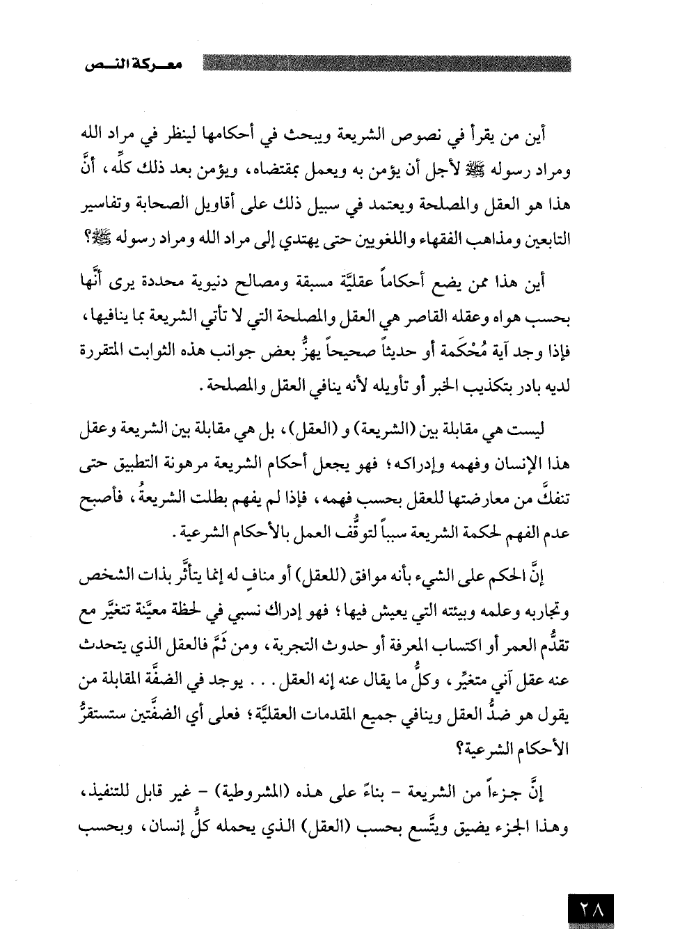 إنَّ الحكم على الشيء بأنه موافق (للعقل) أو منافٍ له إنما يتأثَّر بذات الشخص وتجاربه وعلمه وبيئته التي يعيش فيها؛ فهو إدراك نسبي في لحظة معيَّنة تتغيَّر مع تقدُّم العمر أو اكتساب المعرفة أو حدوث التجربة، ومن ثَمَّ فالعقل الذي يتحدث عنه عقل آني متغيِّر، وكلُّ ما يقال عنه إنه العقل. . . يوجد في الضفَّة المقابلة من يقول هو ضدُّ العقل وينافي جميع المقدمات العقليَّة؛ فعلى أي الضفَّتين ستستقرُّ الأحكام الشرعية؟