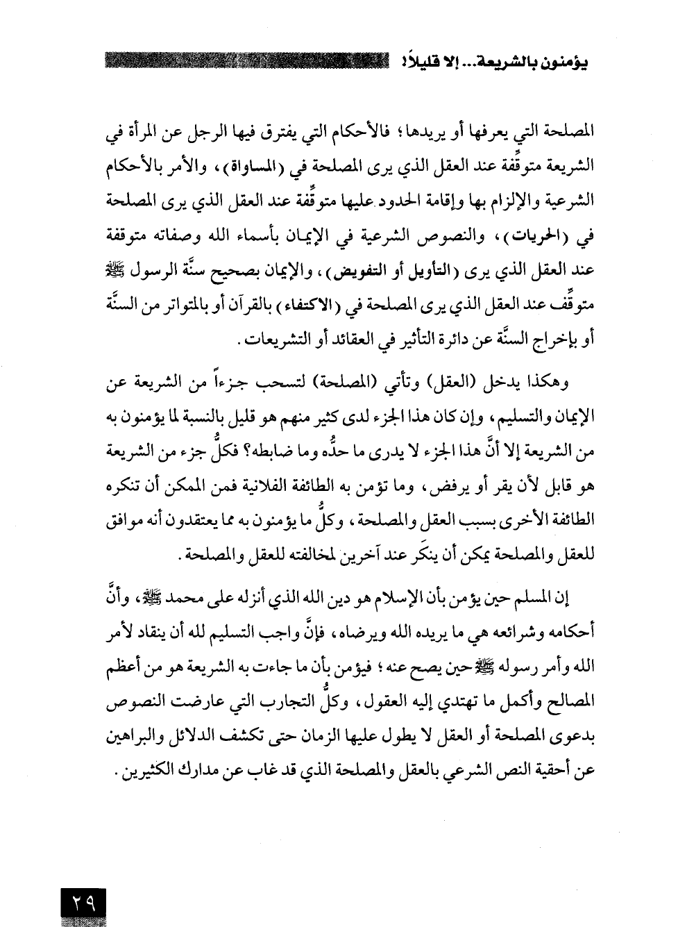 المصلحة التي يعرفها أو يريدها؛ فالأحكام التي يفترق فيها الرجل عن المرأة في الشريعة متوقِّفة عند العقل الذي يرى المصلحة في (المساواة)، والأمر بالأحكام الشرعية والإلزام بها وإقامة الحدود عليها متوقِّفة عند العقل الذي يرى المصلحة في (الحريات)، والنصوص الشرعية في الإيمان بأسماء اللَّه وصفاته متوقفة عند العقل الذي يرى (التأويل أو التفويض)، والإيمان بصحيح سنَّة الرسول -صلى اللَّه عليه وسلم- متوقِّف عند العقل الذي يرى المصلحة في (الاكتفاء) بالقرآن أو بالمتواتر من السنَّة أو بإخراج السنَّة عن دائرة التأثير في العقائد أو التشريعات.