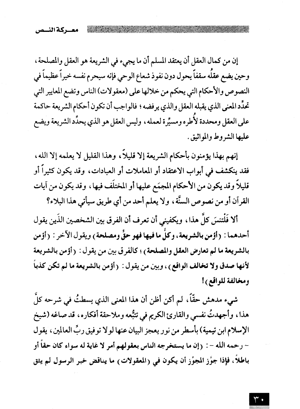 شيء مدهش حقًّا، لم أكن أظن أن هذا المعنى الذي بسطتُ في شرحه كلَّ هذا، وأجهدتُ نفسي والقارئ الكريم في تتبعه وملاحقة أفكاره، قد صاغه (شيخ الإِسلام ابن تيمية) بأسطر من نور يعجز البيان عنها لولا توفيق ربِّ العالمين، يقول -رحمه اللَّه-: (إن ما يستخرجه الناس بعقولهم أمر لا غاية له سواء كان حقًا أو باطلًا، فإذا جوَّز المجوّز أن يكون في (المعقولات) ما يناقض خبر الرسول لم يشق
