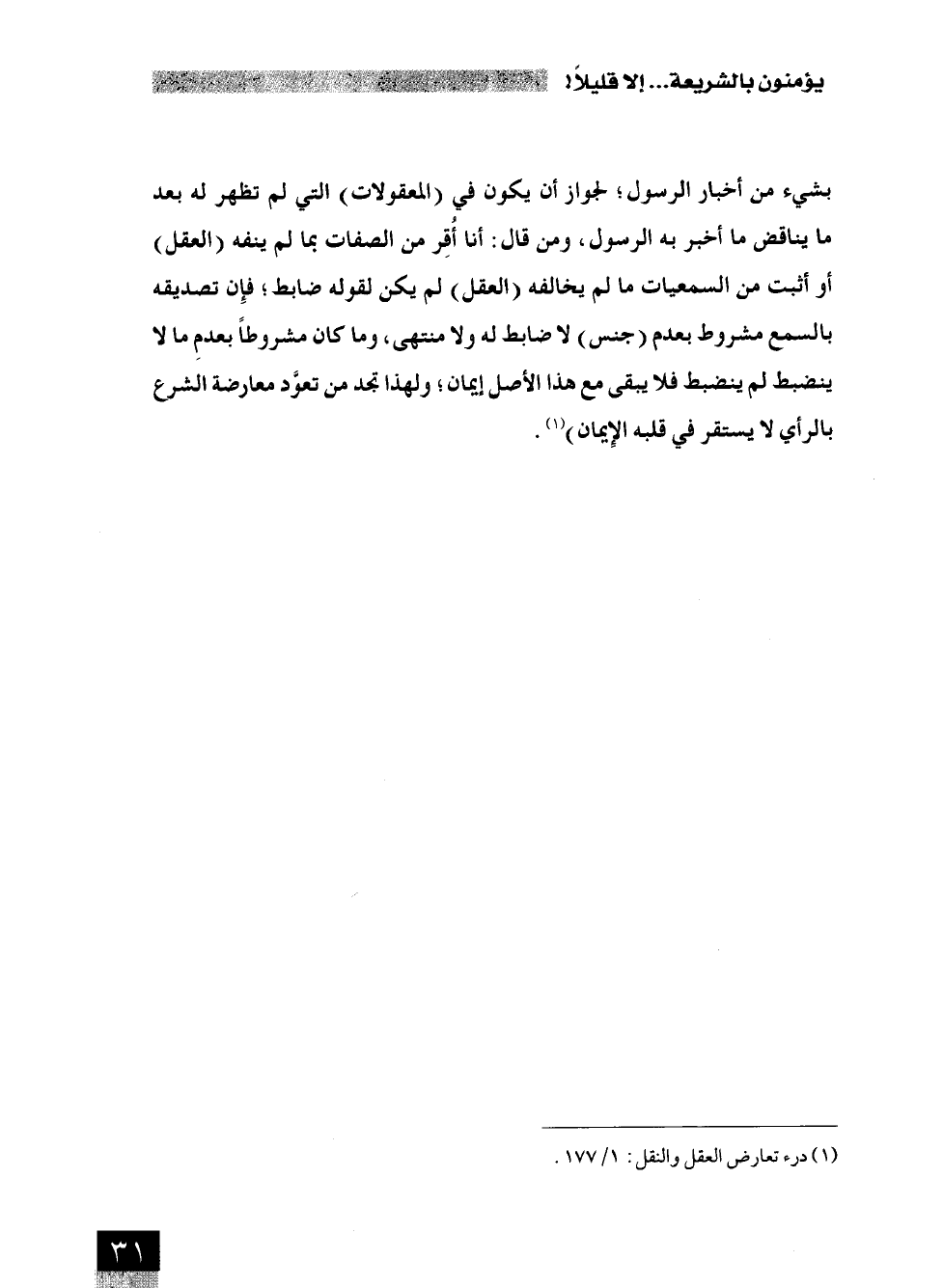 بشيء من أخبار الرسول؛ لجواز أن يكون في (المعقولات) التي لم تظهر له بعد ما يناقض ما أخبر به الرسول، ومن قال: أنا أُقِر من الصفات بما لم ينفه (العقل) أو أثبت من السمعيات ما لم يخالفه (العقل) لم يكن لقوله ضابط؛ فإِن تصديقه بالسمع مشروط بعدم (جنس) لا ضابط له ولا منتهى، وما كان مشروطًا بعدمِ ما لا ينفبط لم ينضبط فلا يبقى مع هذا الأصل إيمان؛ ولهذا تجد من تعوَّد معارفة الشرع بالرأي لا يستقر في قلبه الإِيمان) (¬1).