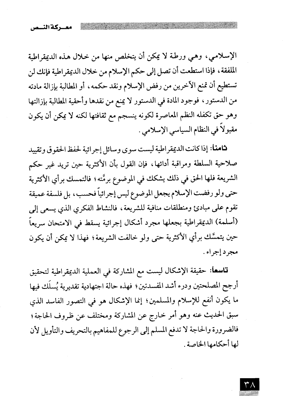 ثامنا: إذا كانت الديمقراطية ليست سوى وسائل إجرائية لحفظ الحقوق وتقييد صلاحية السلطة ومراقبة أدائها، فإن القول بأن الأكثرية حين تريد غير حكم الشريعة فلها الحق في ذلك يشكك في الموضوع برمَّته؛ فالتمسك برأي الأكثرية حتى ولو رفضت الإِسلام يجعل الموضوع ليس إجرائيًا فحسب، بل فلسفة عميقة تقوم على مبادئ ومنطلقات منافية للشريعة، فالنشاط الفكري الذي يسعى إلى (أسلمة) الديمقراطية بجعلها مجرد أشكال إجرائية يسقط في الامتحان سريعًا حين يتمسَّك برأي الأكثرية حتى ولو خالفت الشريعة؛ فهذا لا يمكن أن يكون مجرد إجراء.