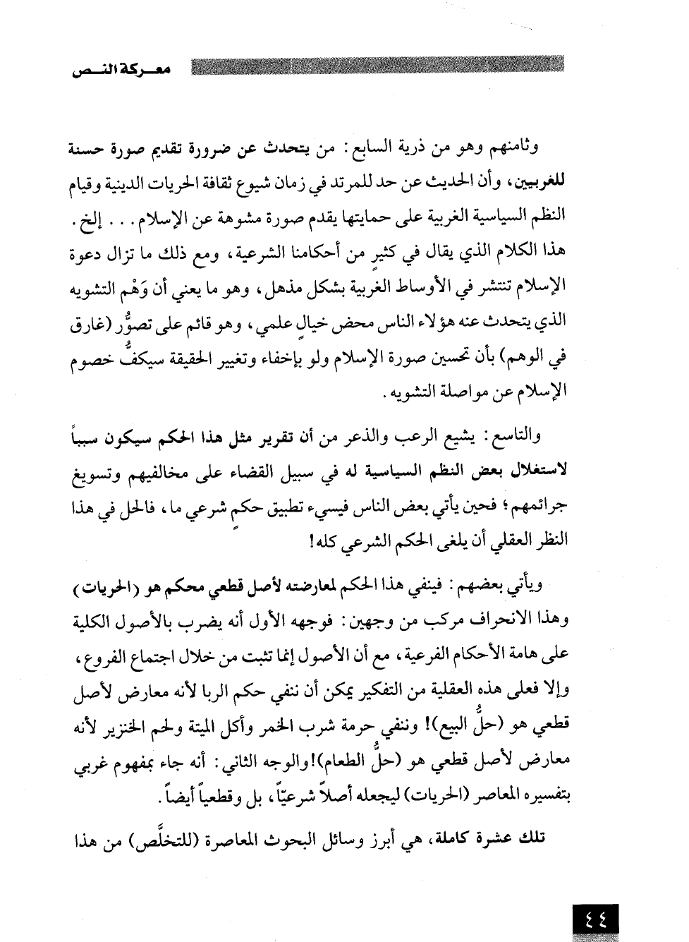 ويأتي بعضهم: فينفي هذا الحكم لمعارضته لأصل قطعي محكم هو (الحريات) وهذا الانحراف مركب من وجهين: فوجهه الأول أنه يضرب بالأصول الكلية على هامة الأحكام الفرعية، مع أن الأصول إنما تثبت من خلال اجتماع الفروع، وإلا فعلى هذه العقلية من التفكير يمكن أن ننفي حكم الربا لأنه معارض لأصل قطعي هو (حلُّ البيع)! وننفي حرمة شرب الخمر وأكل الميتة ولحم الخنزير لأنه معارض لأصل قطعي هو (حلُّ الطعام)! والوجه الثاني: أنه جاء بمفهوم غربي بتفسيره المعاصر (الحريات) ليجعله أصلًا شرعيًّا، بل وقطعيًا أيضًا.