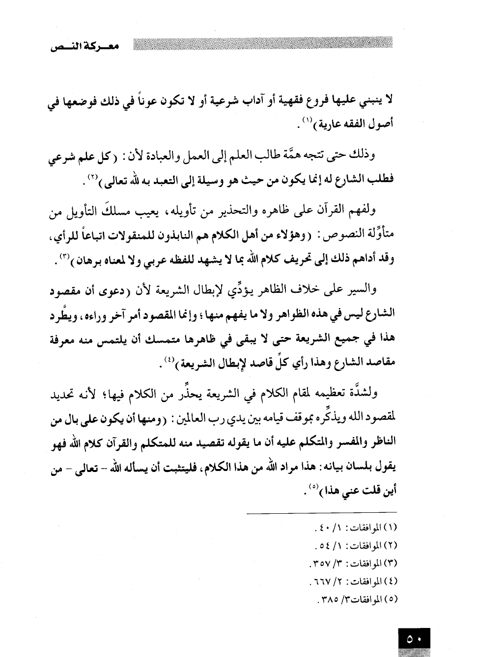 ولفهم القرآن على ظاهره والتحذير من تأويله، يعيب مسلكَ التأويل من متأوِّلة النصوص: (وهؤلاء من أهل الكلام هم النابذون للمنقولات اتباعًا للرأي، وقد أداهم ذلك إلى تحريف كلام اللَّه بما لا يشهد للفظه عربي ولا لمعناه برهان) (¬3).