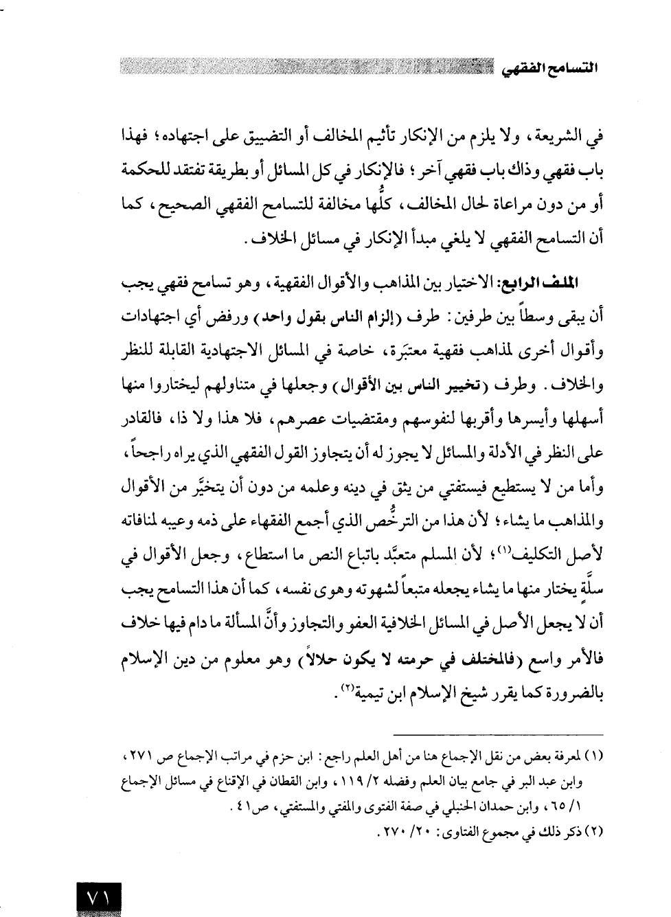 في الشريعة، ولا يلزم من الإنكار تأثيم المخالف أو التضييق على اجتهاده؛ فهذا باب فقهي وذاك باب فقهي آخر؛ فالإنكار في كل المسائل أو بطريقة تفتقد للحكمة أو من دون مراعاة لحال المخالف، كلُّها مخالفة للتسامح الفقهي الصحيح، كما أن التسامح الفقهي لا يلغي مبدأ الإنكار في مسائل الخلاف.