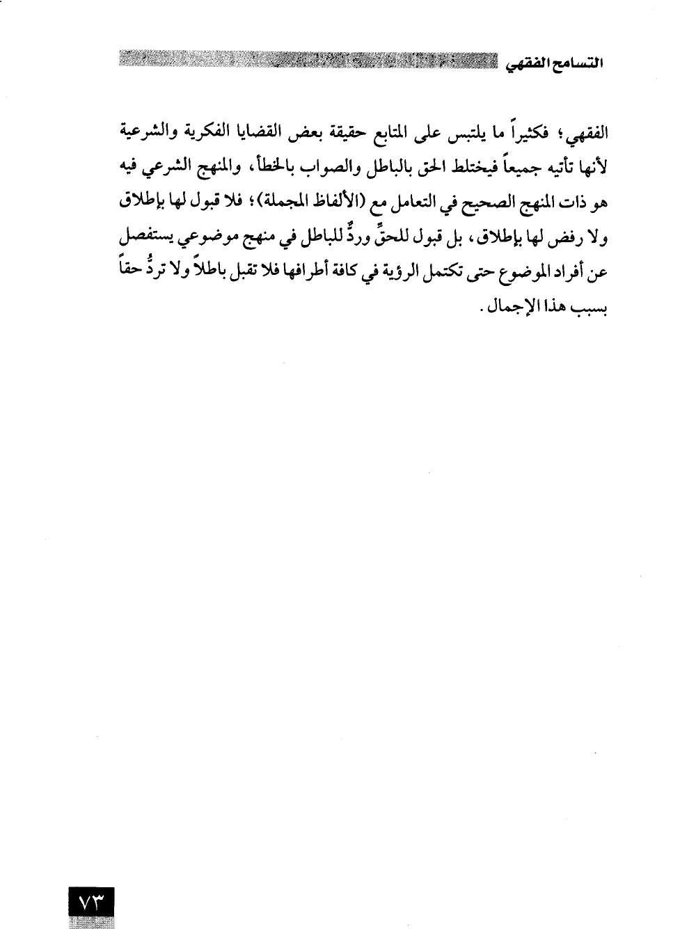 الفقهي؛ فكثيرًا ما يلتبس على المتابع حقيقة بعض القضايا الفكرية والشرعية لأنها تأتيه جميعًا فيختلط الحق بالباطل والصواب بالخطأ، والمنهج الشرعي فيه هو ذات المنهج الصحيح في التعامل مع (الألفاظ المجملة)؛ فلا قبول لها بإطلاق ولا رفض لها بإطلاق، بل قبول للحق ورد للباطل في منهج موضوعي يستفصل عن أفراد الموضوع حتى تكتمل الرؤية في كافة أطرافها فلا تقبل باطلًا ولا تردُّ حقًا بسبب هذا الإجمال.