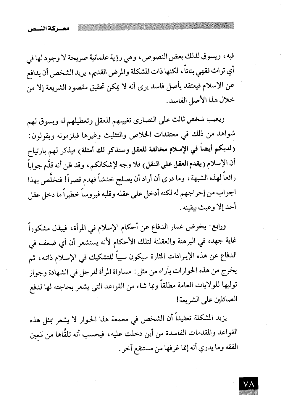 فيه، ويسوق لذلك بعض النصوص، وهي رؤية علمانية صريحة لا وجود لها في أي تراث فقهي بتاتًا، لكنها ذات المشكلة والمرض القديم، يريد الشخص أن يدافع عن الإسلام فيعتقد بأصل فاسد يرى أنه لا يمكن تحقيق مقصود الشريعة إلا من خلال هذا الأصل الفاسد.