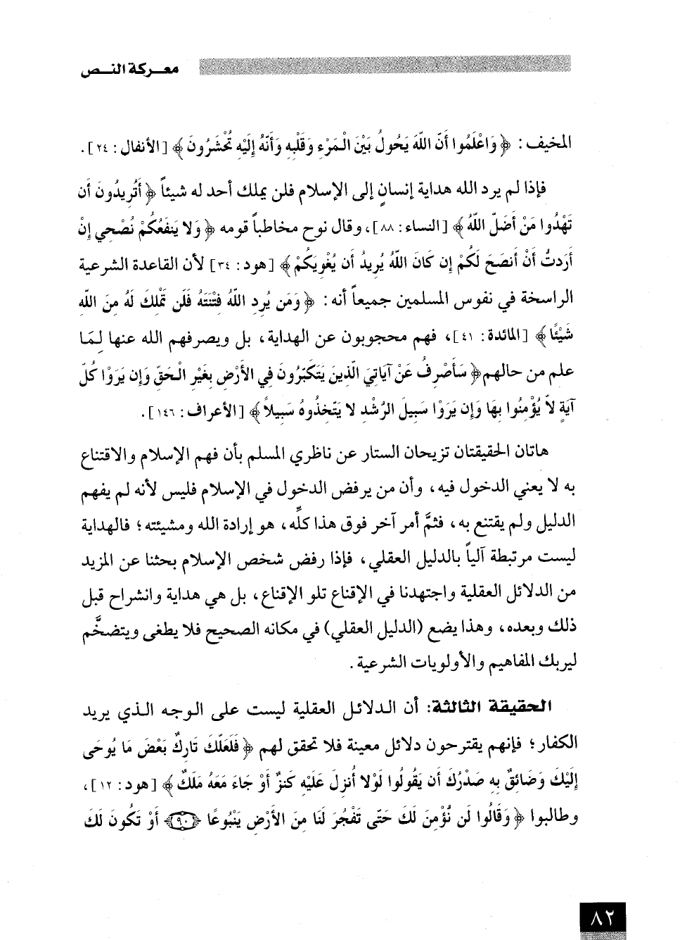 هاتان الحقيقتان تزيحان الستار عن ناظري المسلم بأن فهم الإسلام والاقتناع به لا يعني الدخول فيه، وأن من يرفض الدخول في الإسلام فليس لأنه لم يفهم الدليل ولم يقتنع به، فثمَّ أمر آخر فوق هذا كلِّه، هو إرادة اللَّه ومشيئته؛ فالهداية ليست مرتبطة آليًا بالدليل العقلي، فإذا رفض شخص الإسلام بحثنا عن المزيد من الدلائل العقلية واجتهدنا في الإقناع تلو الإقناع، بل هي هداية وانشراح قبل ذلك وبعده، وهذا يضع (الدليل العقلي) في مكانه الصحيح فلا يطغى ويتضخم ليربك المفاهيم والأولويات الشرعية.