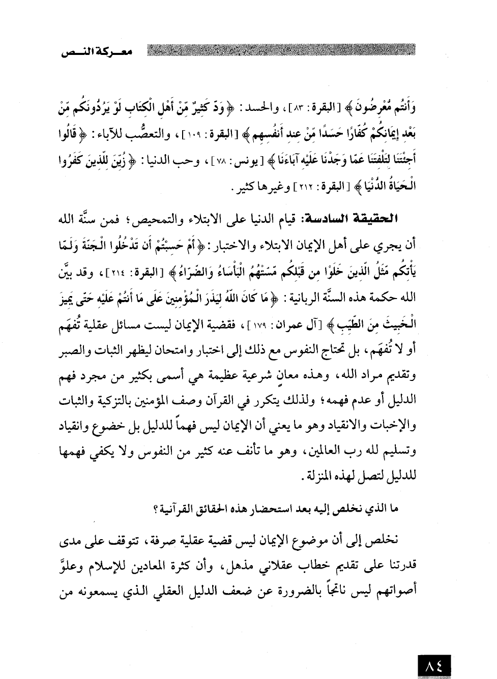 الحقيقة السادسة: قيام الدنيا على الابتلاء والتمحيص؛ فمن سنَّة اللَّه أن يجري على أهل الإيمان الابتلاء والاختبار: {أَمْ حَسِبْتُمْ أَنْ تَدْخُلُوا الْجَنَّةَ وَلَمَّا يَأْتِكُمْ مَثَلُ الَّذِينَ خَلَوْا مِنْ قَبْلِكُمْ مَسَّتْهُمُ الْبَأْسَاءُ وَالضَّرَّاءُ} [البقرة: 214]، وقد بيَّن اللَّه حكمة هذه السنَّة الربانية: {مَا كَانَ اللَّهُ لِيَذَرَ الْمُؤْمِنِينَ عَلَى مَا أَنْتُمْ عَلَيْهِ حَتَّى يَمِيزَ الْخَبِيثَ مِنَ الطَّيِّبِ} [آل عمران: 179]، فقضية الإيمان ليست مسائل عقلية تُفهَم أو لا تُفهَم، بل تحتاج النفوس مع ذلك إلى اختبار وامتحان ليظهر الثبات والصبر وتقديم مراد اللَّه، وهذه معانٍ شرعية عظيمة هي أسمى بكثير من مجرد فهم الدليل أو عدم فهمه، ولذلك يتكرر في القرآن وصف المؤمنين بالتزكية والثبات والإخبات والانقياد وهو ما يعني أن الإيمان ليس فهمًا للدليل بل خضوع وانقياد وتسليم للَّه رب العالمين، وهو ما تأنف عنه كثير من النفوس ولا يكفي فهمها للدليل لتصل لهذه المنزلة.