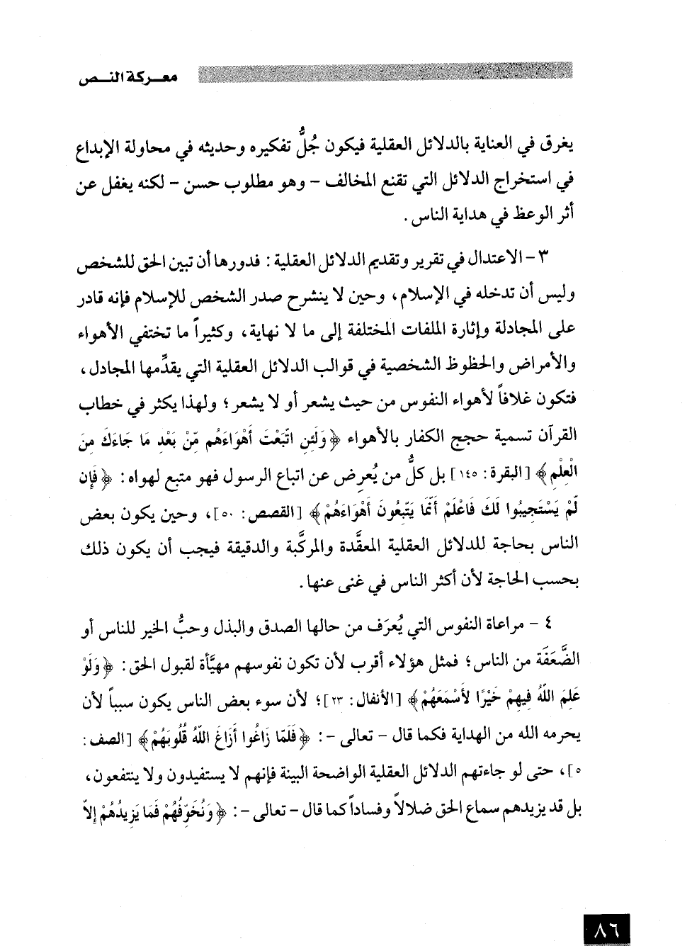 3 - الاعتدال في تقرير وتقديم الدلائل العقلية: فدورها أن تبين الحق للشخص وليس أن تدخله في الإسلام، وحين لا ينشرح صدر الشخص للإسلام فإنه قادر على المجادلة وإثارة الملفات المختلفة إلى ما لا نهاية، وكثيرًا ما تختفي الأهواء والأمراض والحظوظ الشخصية في قوالب الدلائل العقلية التي يقدِّمها المجادل، فتكون غلافًا لأهواء النفوس من حيث يشعر أو لا يشعر؛ ولهذا يكثر في خطاب القرآن تسمية حجج الكفار بالأهواء {وَلَئِنِ اتَّبَعْتَ أَهْوَاءَهُمْ مِنْ بَعْدِ مَا جَاءَكَ مِنَ الْعِلْمِ} [البقرة: 145]، بل كلُّ من يُعرِض عن اتباع الرسول فهو متبع لهواه: {فَإِنْ لَمْ يَسْتَجِيبُوا لَكَ فَاعْلَمْ أَنَّمَا يَتَّبِعُونَ أَهْوَاءَهُمْ} [القصص: 50]، وحين يكون بعض الناس بحاجة للدلائل العقلية المعقدة والمركَّبة والدقيقة فيجب أن يكون ذلك بحسب الحاجة لأن أكثر الناس في غنى عنها.