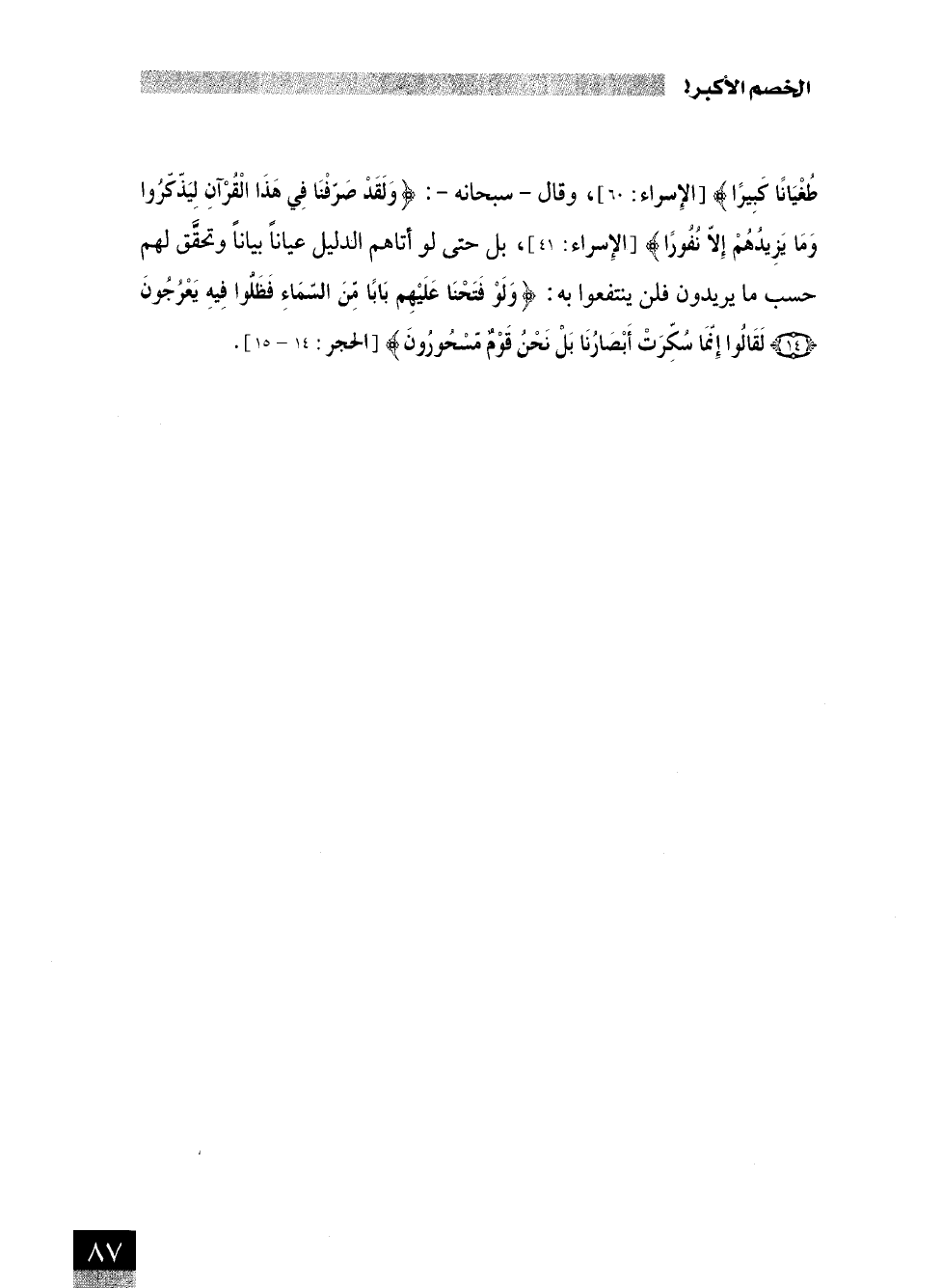 طُغْيَانًا كَبِيرًا} [الإسراء: 60]، وقال -سبحانه-: {وَلَقَدْ صَرَّفْنَا فِي هَذَا الْقُرْآنِ لِيَذَّكَّرُوا وَمَا يَزِيدُهُمْ إِلَّا نُفُورًا} [الإسراء: 41]، بل حتى لو أتاهم الدليل عيانًا بيانًا وتحقَّق لهم حسب ما يريدون فلن ينتفعوا به: {وَلَوْ فَتَحْنَا عَلَيْهِمْ بَابًا مِنَ السَّمَاءِ فَظَلُّوا فِيهِ يَعْرُجُونَ (14) لَقَالُوا إِنَّمَا سُكِّرَتْ أَبْصَارُنَا بَلْ نَحْنُ قَوْمٌ مَسْحُورُونَ} [الحجر: 14 - 15].
