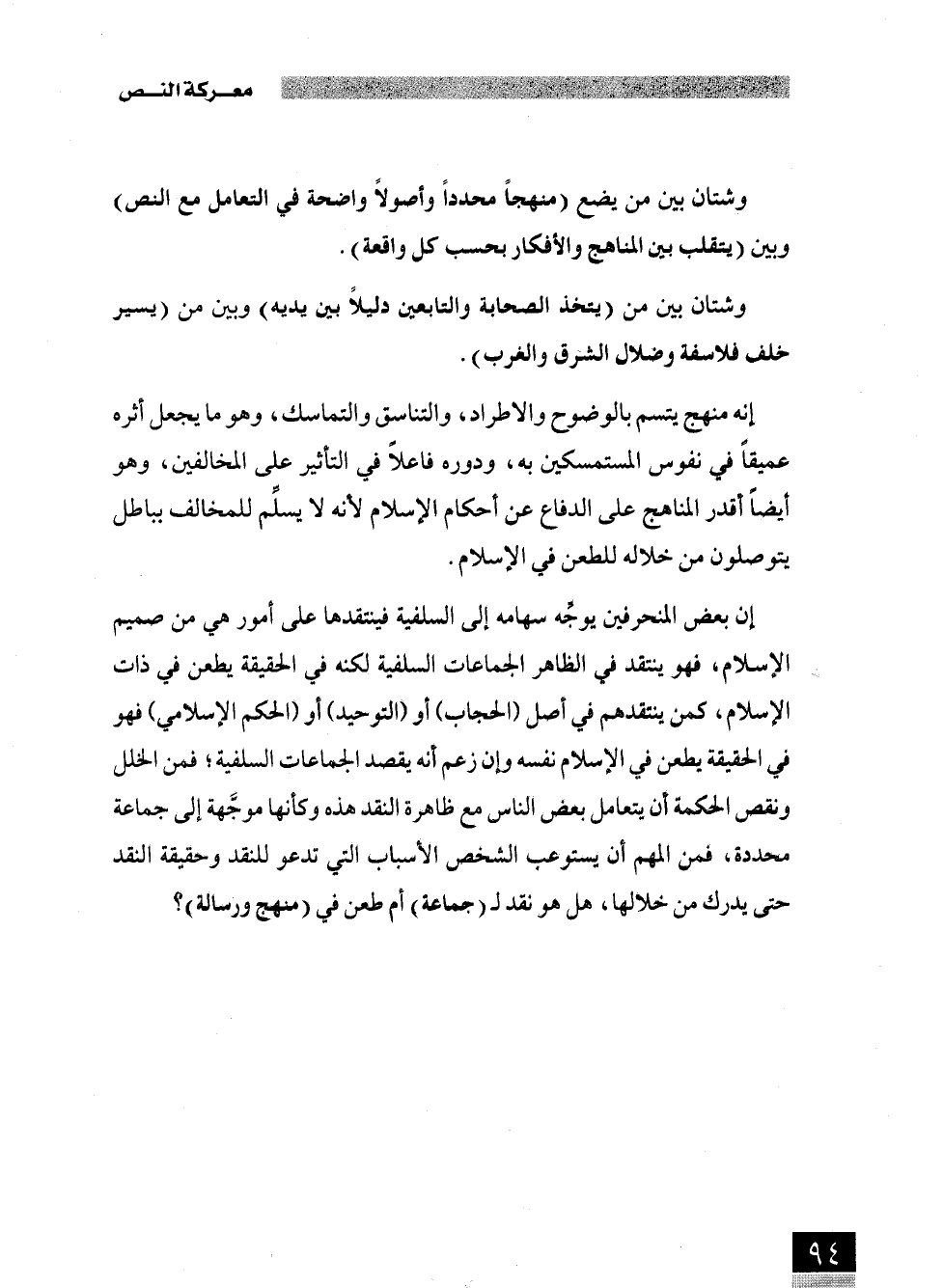 إنه منهج يتسم بالوضوح والاطراد، والتناسق والتماسك، وهو ما يجعل أثره عميقًا في نفوس المستمسكين به، ودوره فاعلًا في التأثير على المخالفين، وهو أيضًا أقدر المناهج على الدفاع عن أحكام الاسلام لأنه لا يسلم للمخالف بباطل يتوصلون من خلاله للطعن في الإسلام.